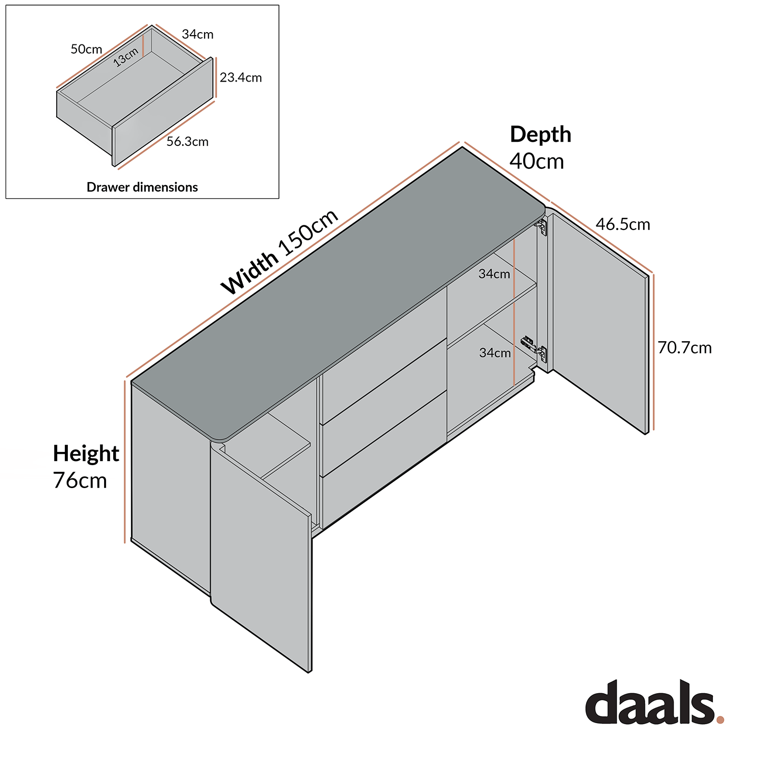 - Item size: W 150 x D 40 x H 76 cm.
