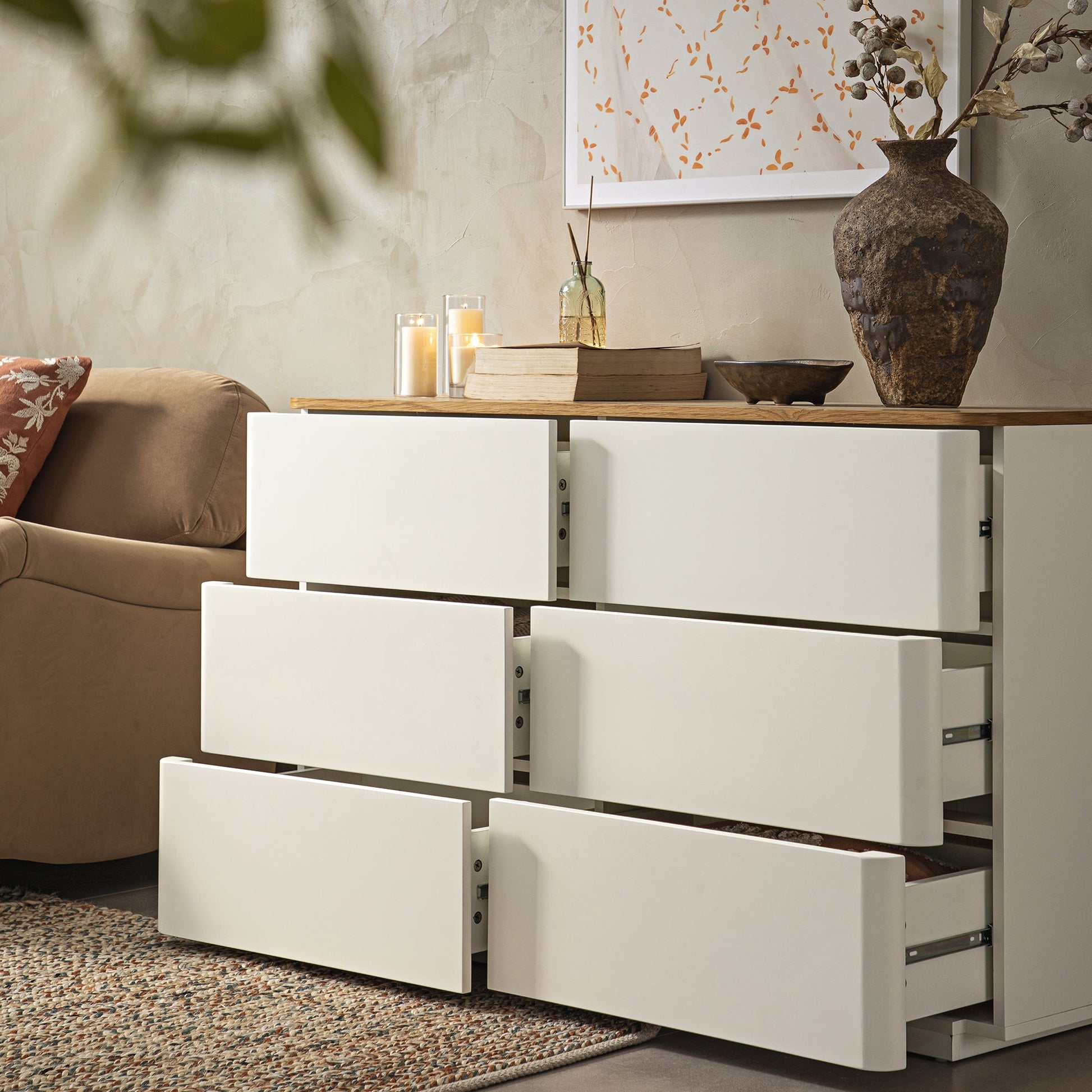 - Complete the look: Pictured with our Agnes Curved Edge Chest of 6 Drawers is our Daphnis Camel Velvet One Seater Sofa and our Aurora Hand Braided Bronze and Teal Jute Rug