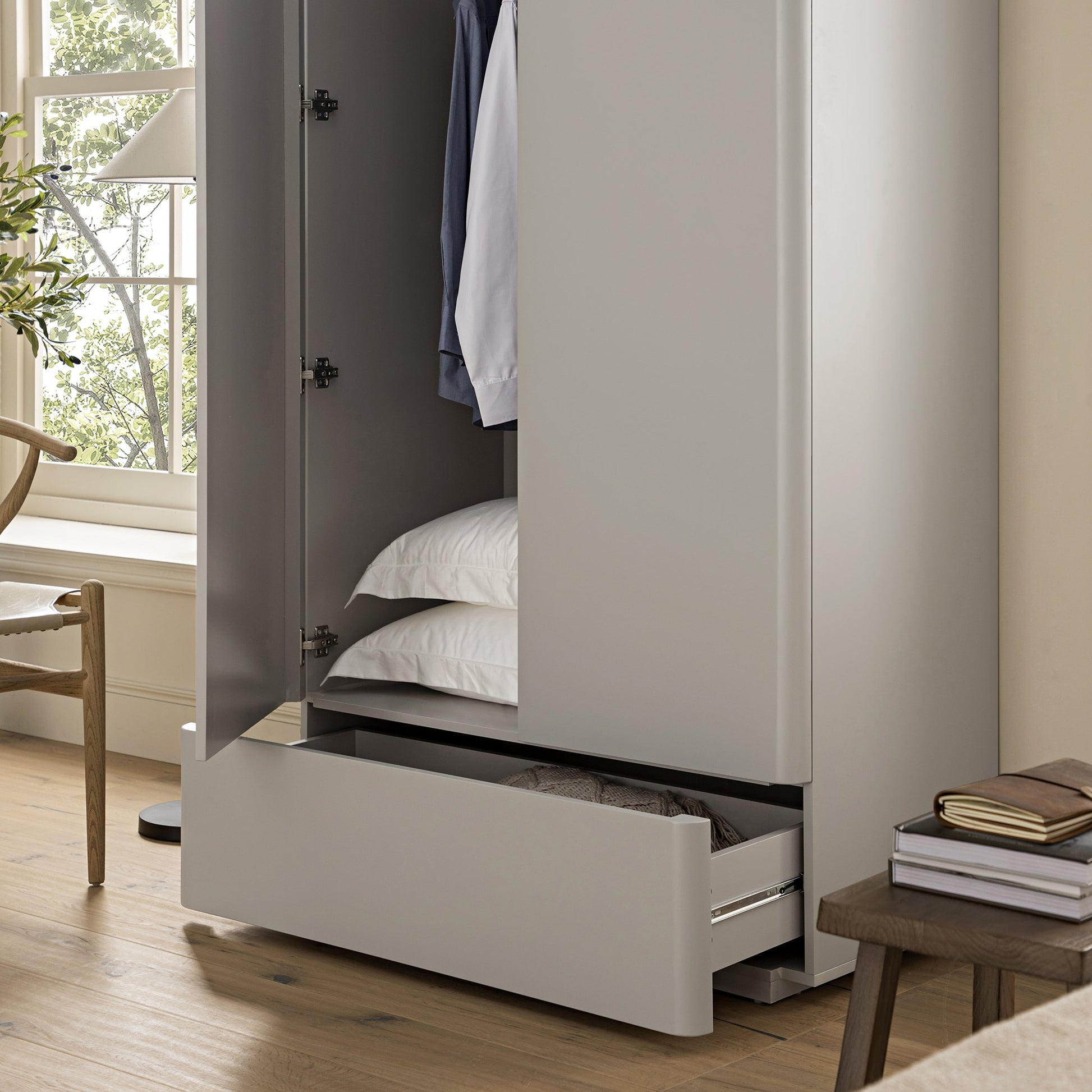 - The top panel of the wardrobe is made from solid oak veneer for a cosy, sophisticated look.