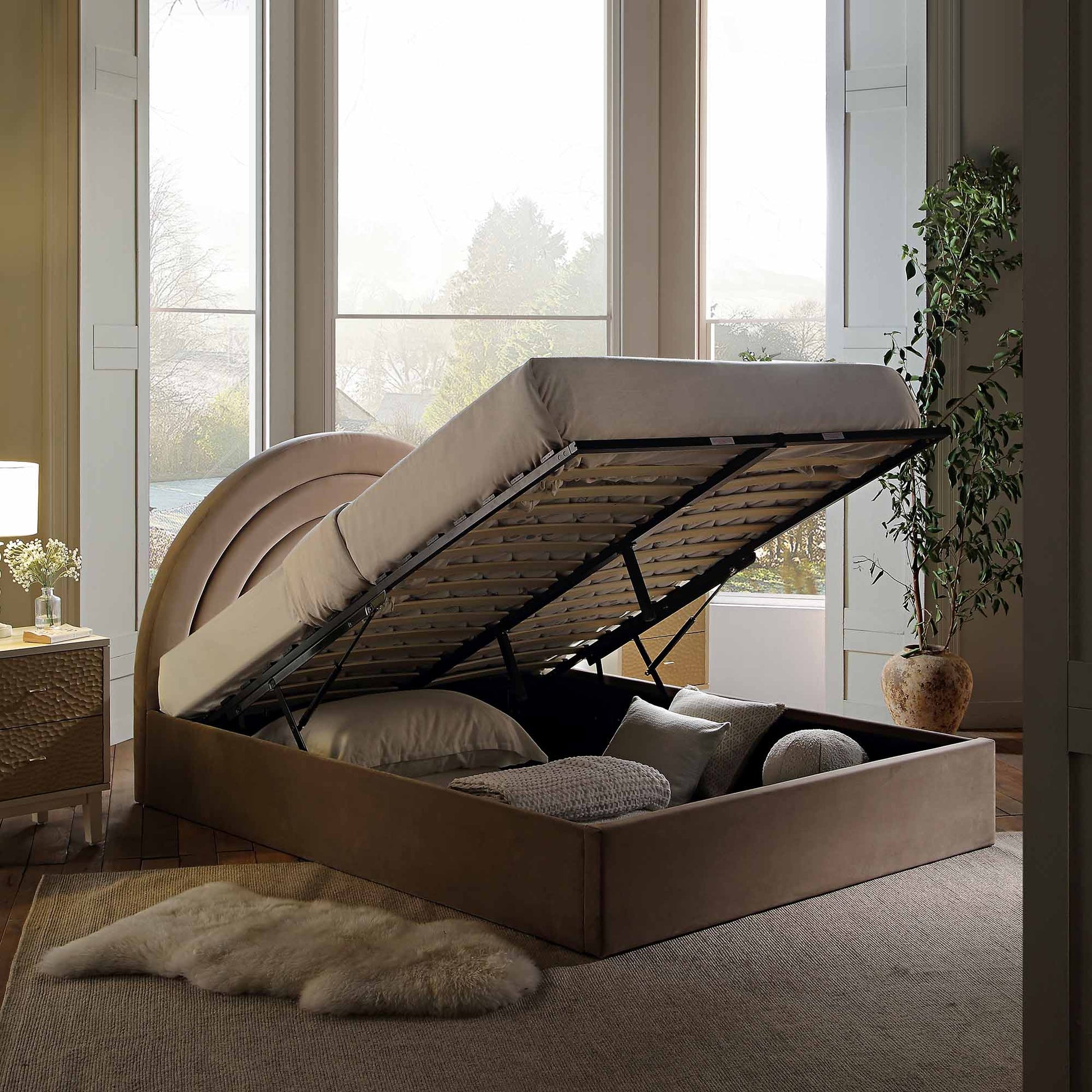 - Complete the look: Pictured with our Archer Mink Velvet Ottoman Storage Bed is our Bianca Chip Carved Bedside Table in Beige and Ivory