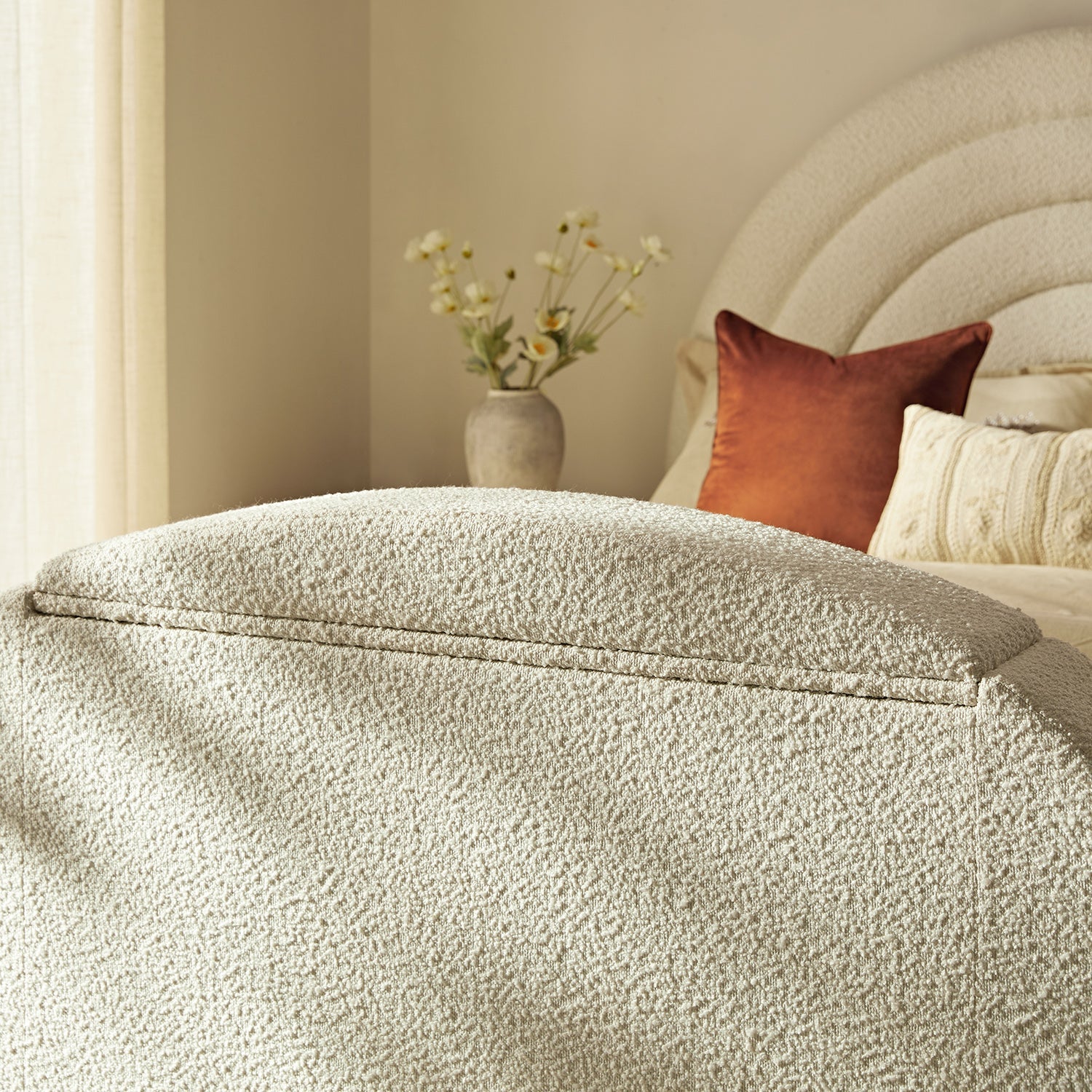 - Upholstered in tactile white boucle fabric, the arched, layered headboard adds a bold architectural feel while still offering a soft, cocooning presence in your bedroom.