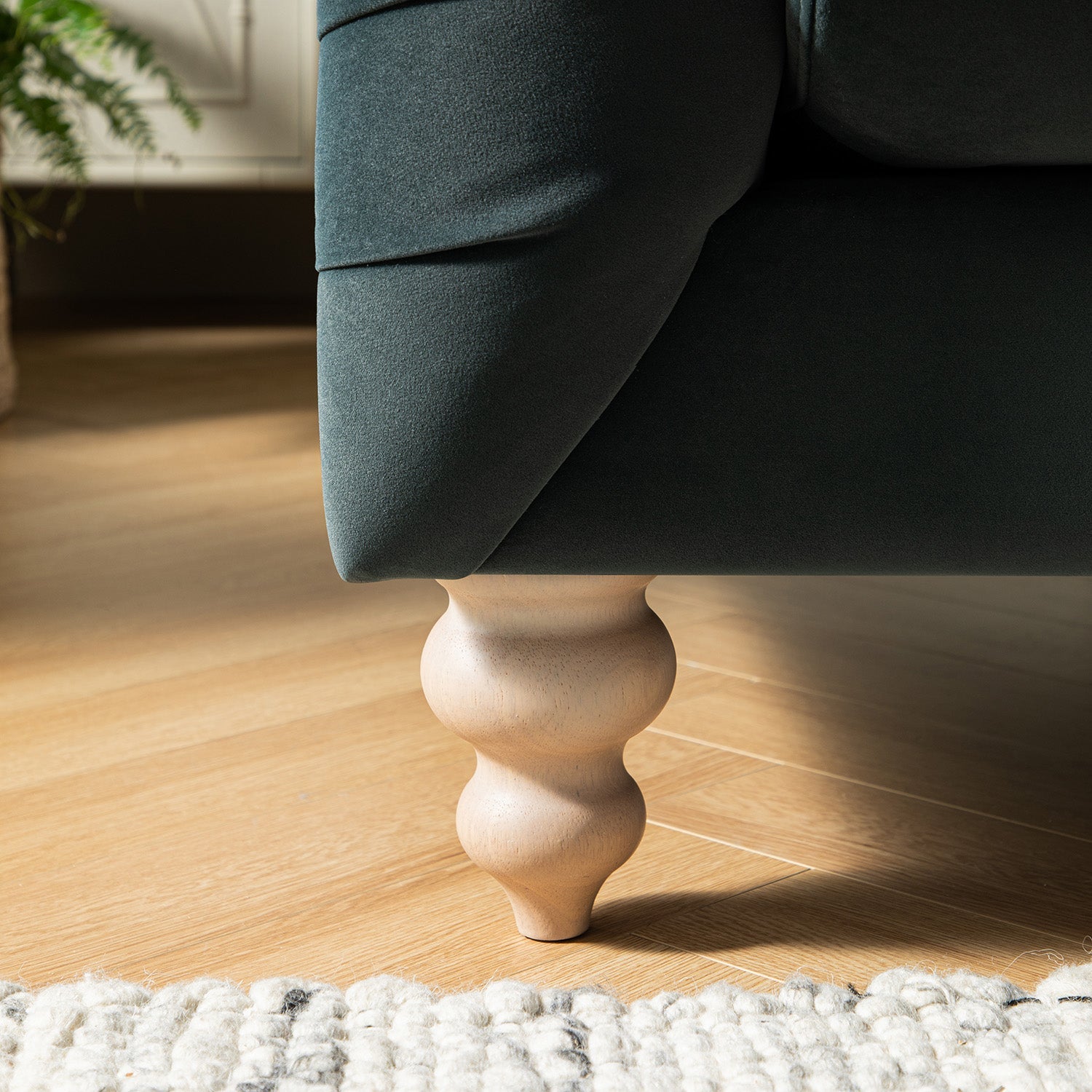 - Complete the look: Pictured with the Ashby Aegean Blue Velvet Chesterfield Sofa is our Flora & Fauna Hand Embroidered Songbird Cushion, Flora & Fauna Hand Embroidered Tree Of Life Cushion, Indra Light Grey Handwoven Wool Rug, Oakham Stormy Blue Square Coffee Table and Elstowe Shaded White Faux Bamboo Large Sideboard.