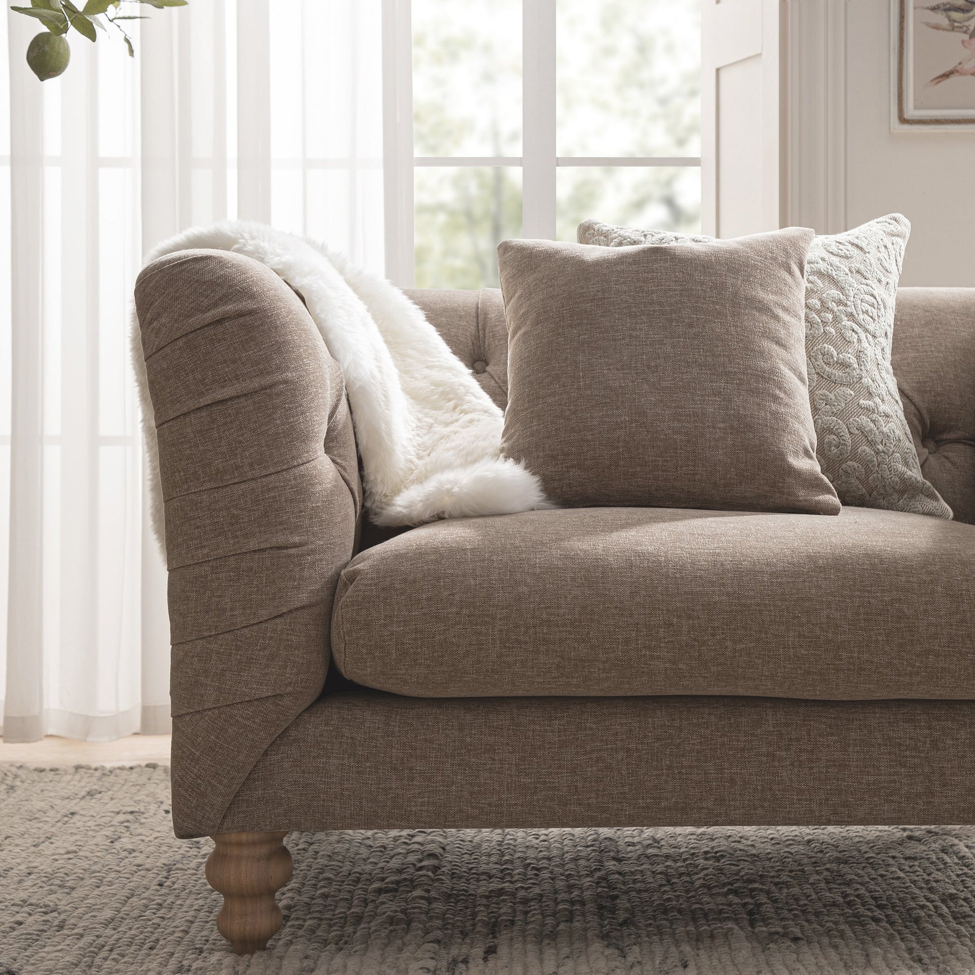 - Slightly distressed turned solid wood legs complement the beautiful neural appeal of the sofa.