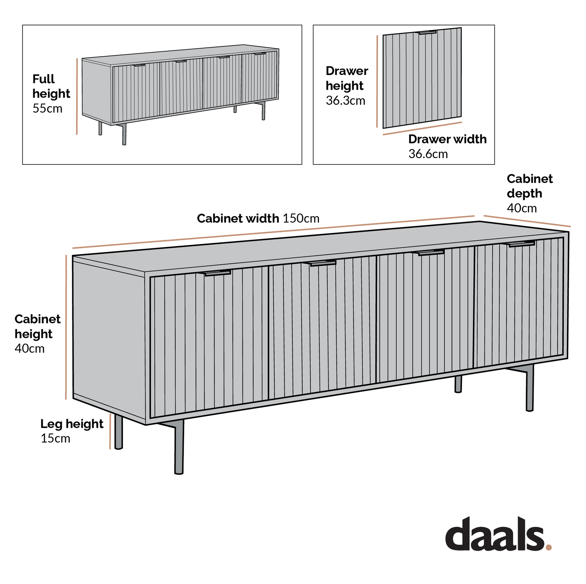 - The TV unit features striking oak effect textured cabinet door fronts against a simple frame with marble effect veneer which stands firmly on slender black metal legs coordinating with the black handles.