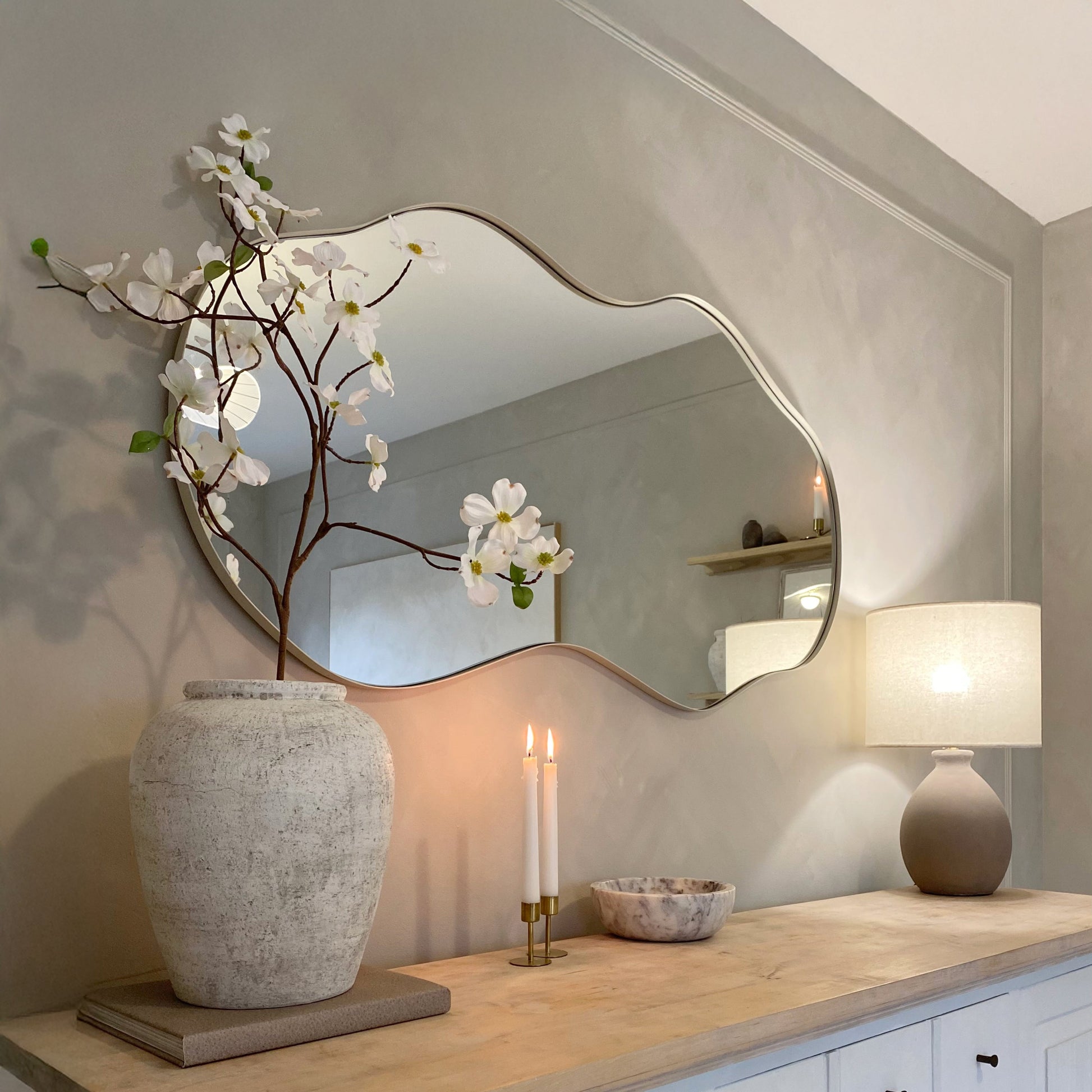 Embracing an asymmetrical design, this Ava mirror’s irregular contours evoke the ripples and curves of a round, tranquil pond, reflecting a sense of serenity and calm.