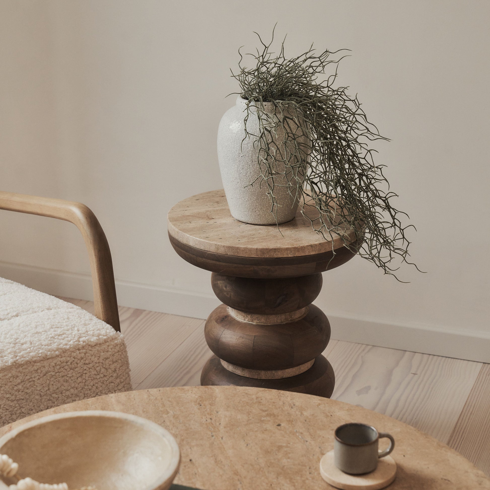 Belgravia - Beige Travertine Round Warm Wood Premium Side Table