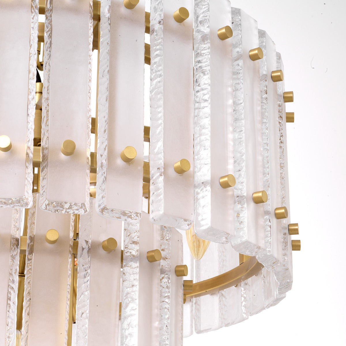 With a stunning two-layer design, the Blason Chandelier offers a striking and magnificent look for both classic and contemporary interiors. This antique brass finish chandelier is beautifully embellished with thick frosted glass plates, which are designed to expertly capture and reflect light, providing a shimmering textured effect that is perfect for living areas.