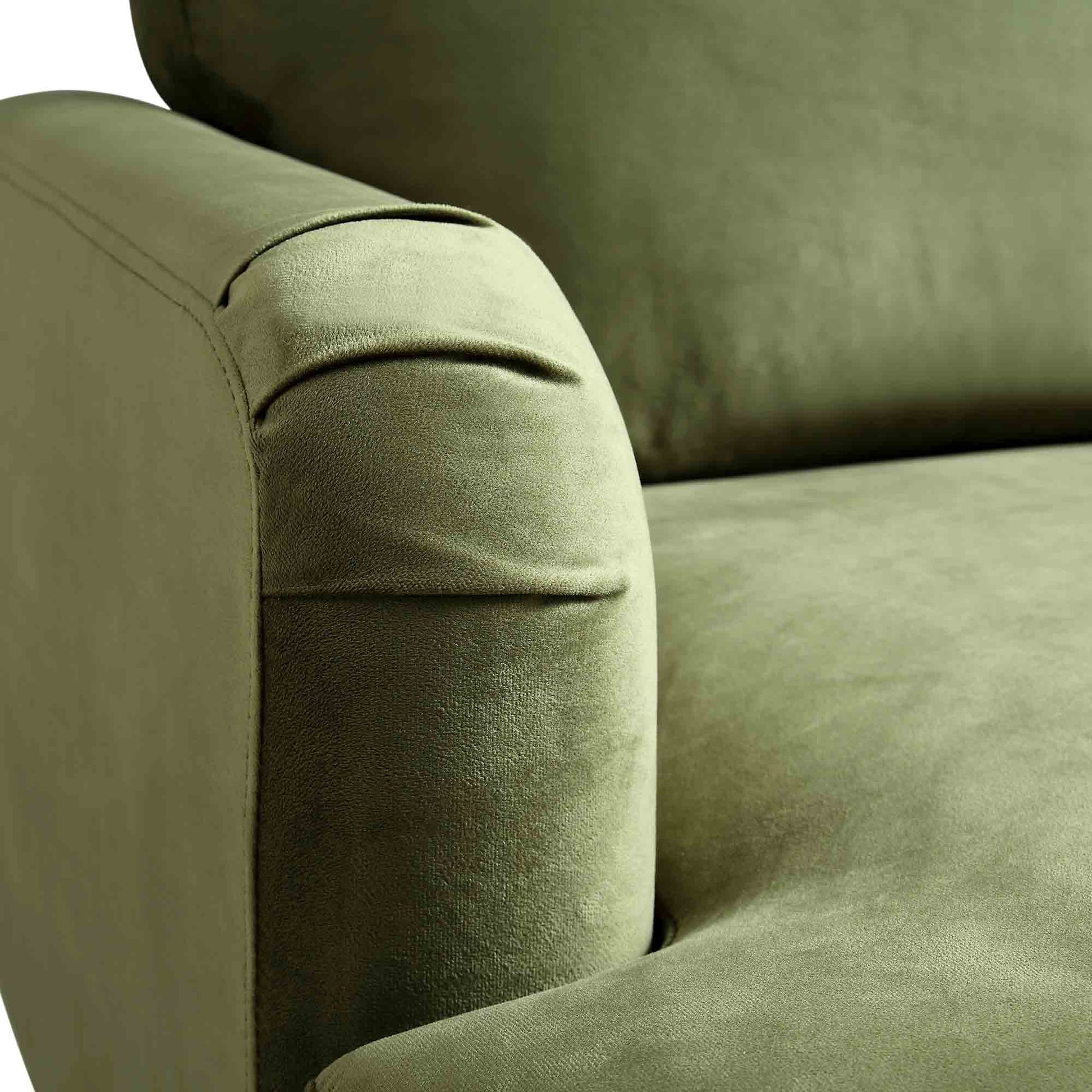 - Crafted from solid wood and metal frame, the cushions are filled with foam and upholstered with soft cosy velvet feel fabric in beautiful moss green colour.