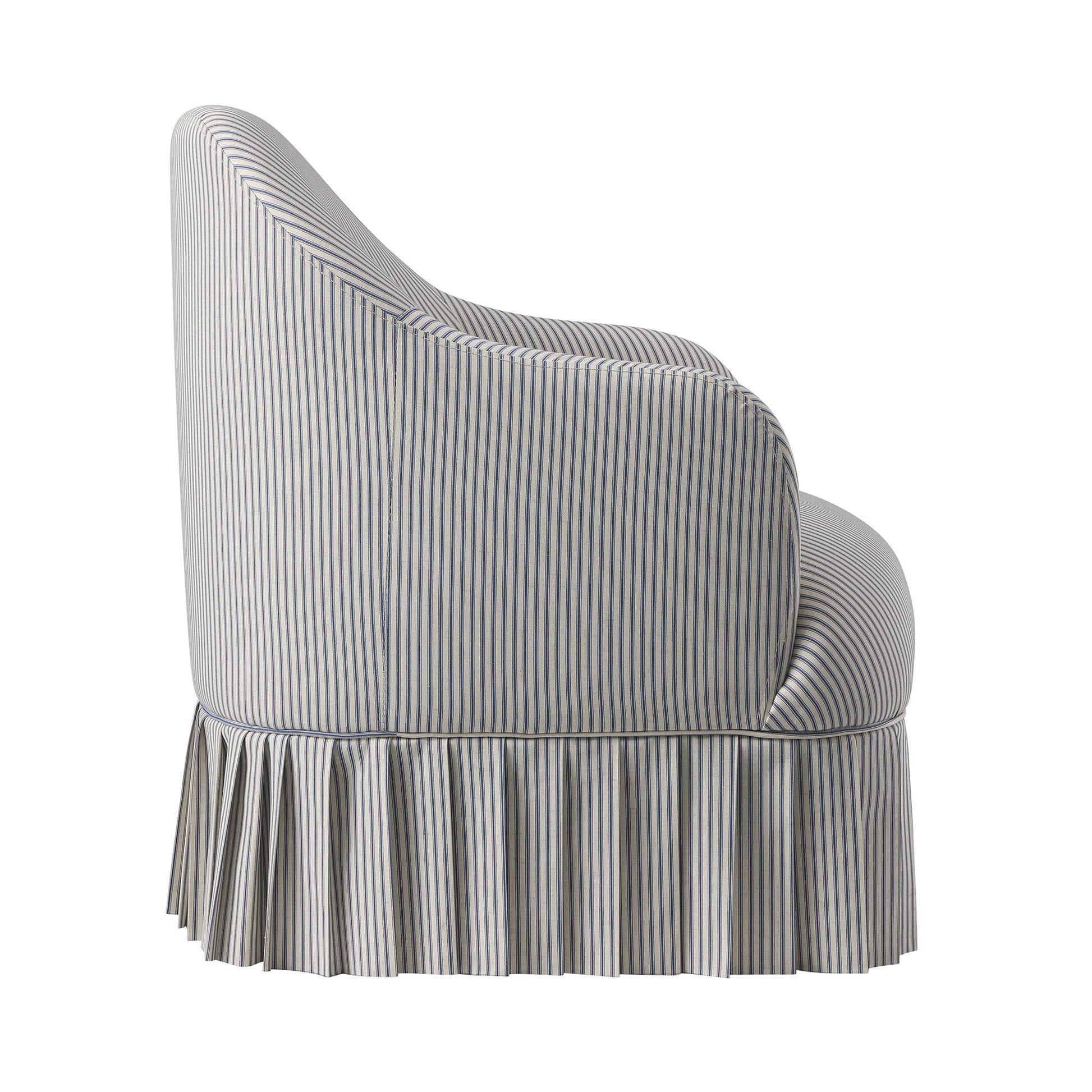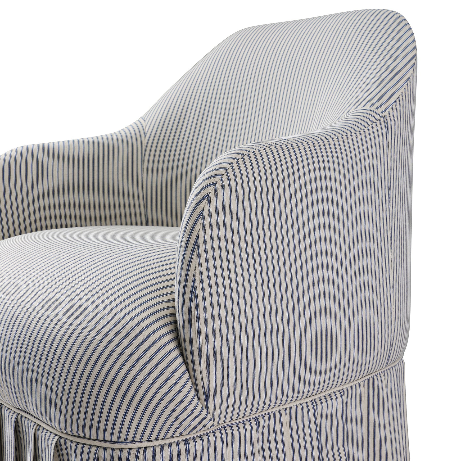 - Complete the look: Pictured with the Calliope Blue Striped Skirted Armchair is our Evie Hand Braided Jute Scallop Navy Blue Border Rectangular Rug and Edith Reversible Linen Blend Faded Denim Blue Striped Frill Cushion.