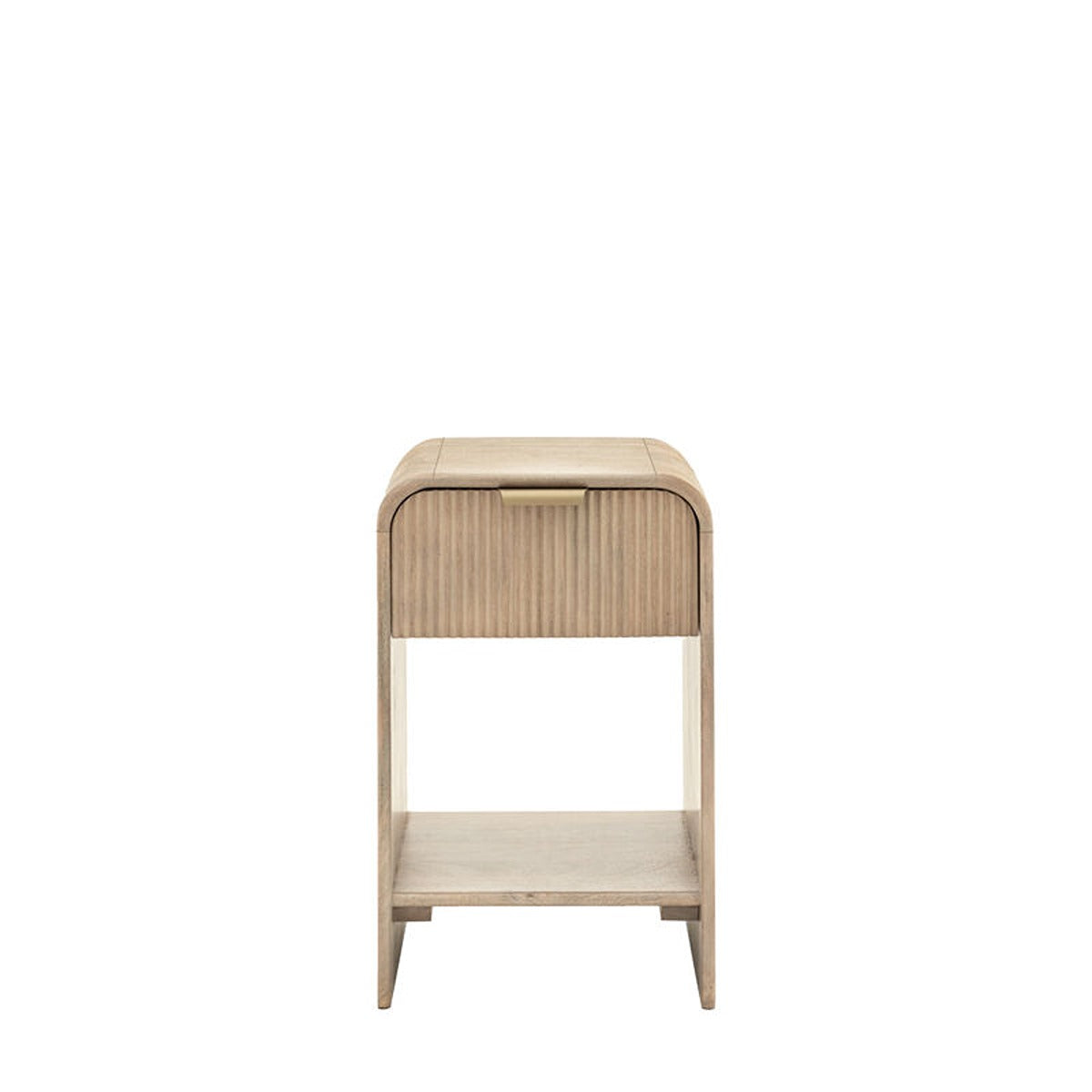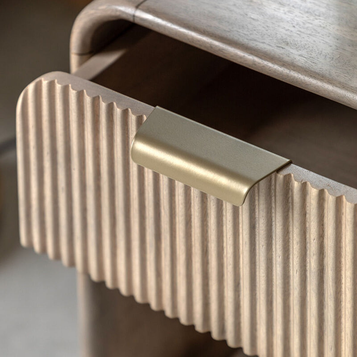 The sleek bedside table, with its curved design and fluted drawer, adds a touch of modern elegance to any bedroom. Crafted from high-quality wood, it offers both style and functionality. The spacious drawer and lower shelf provide ample storage for books, glasses, and other bedside essentials.