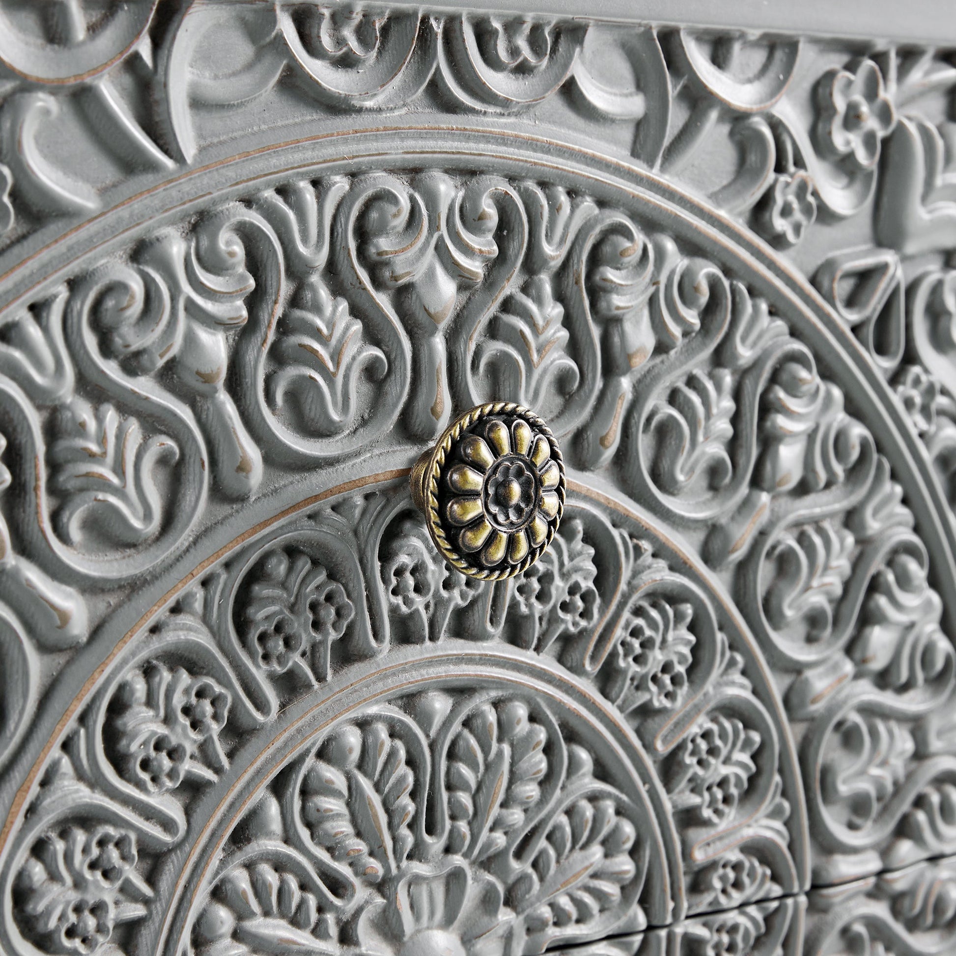 - Each drawer front is adorned with a carved floral motif, creating a striking focal point even in smaller spaces.