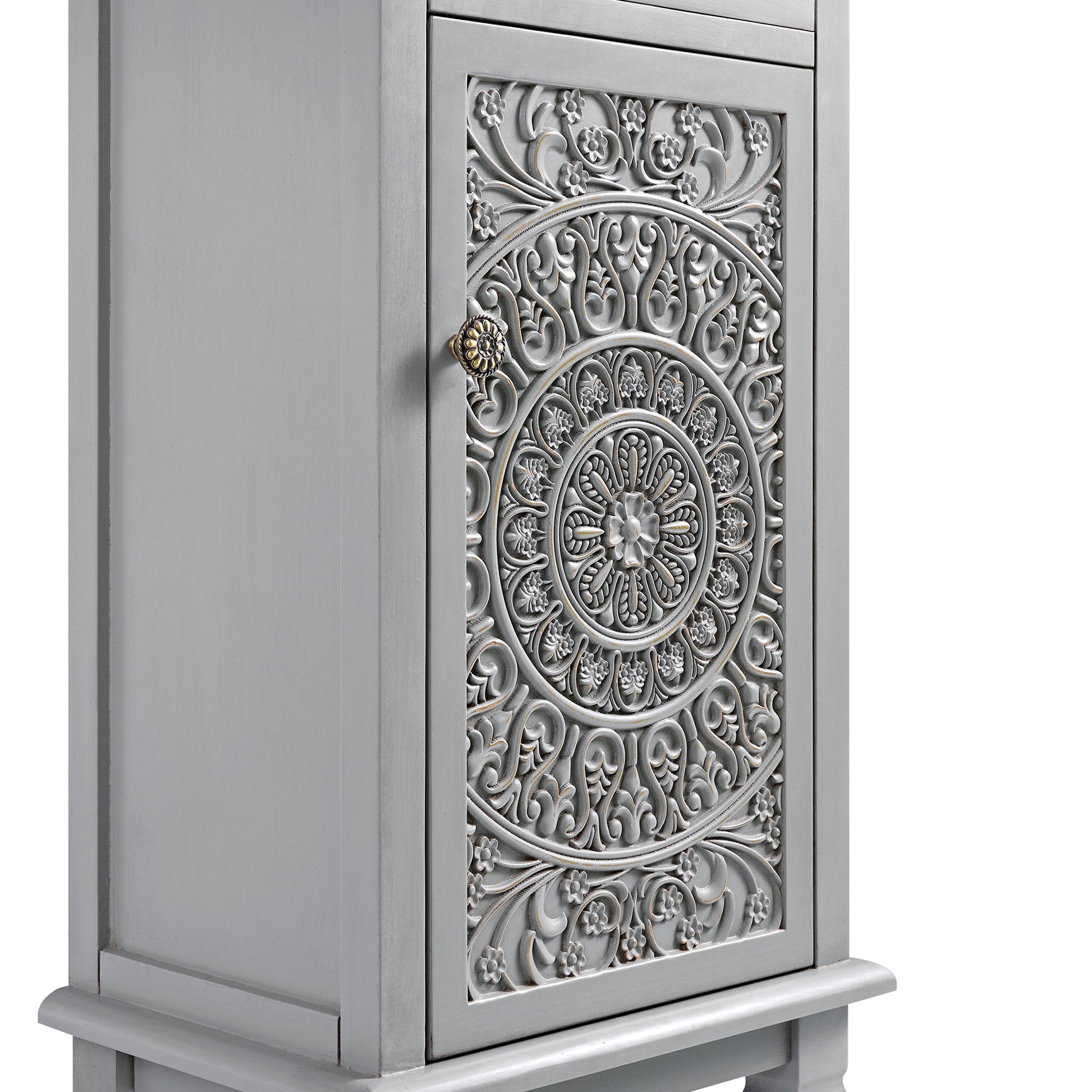 - With its delicately hand-carved front and soft mid grey finish, the Chantilly bathroom cupboard brings timeless character to compact storage.