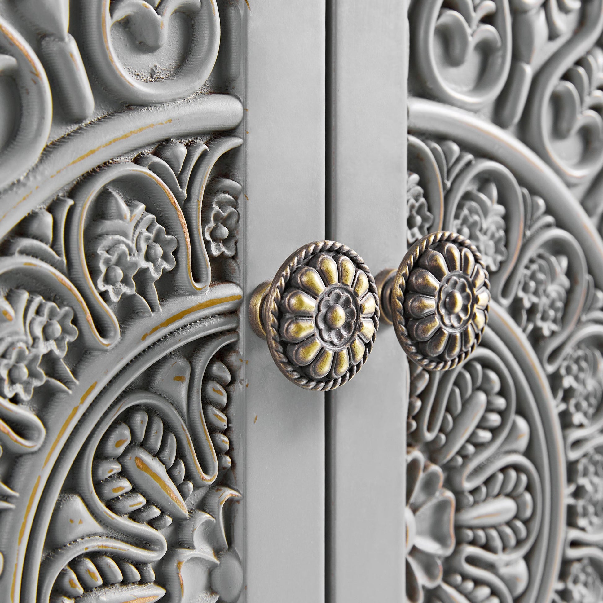 - Finished in a mid grey paint, this undersink unit features double doors with carved front panels and antique-style knobs.