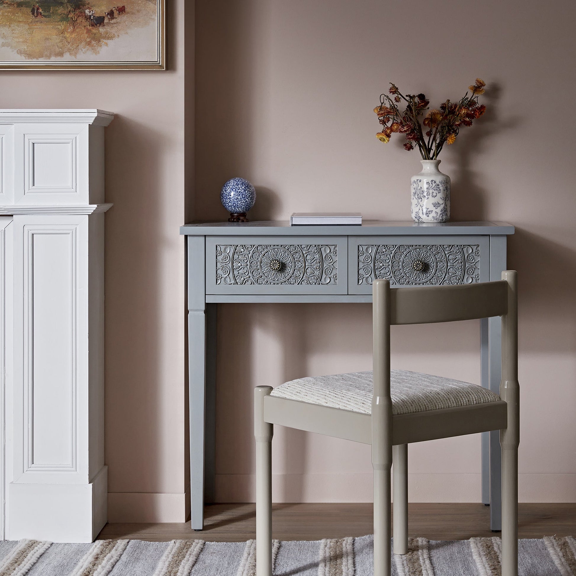- Complete the look: Pictured with the Chantilly Mid Grey Carved Console/ Dressing Table is our Minley Light Taupe High Gloss 2-in-1 Dining Chair and Villa Stripe Handwoven Grey Rug.