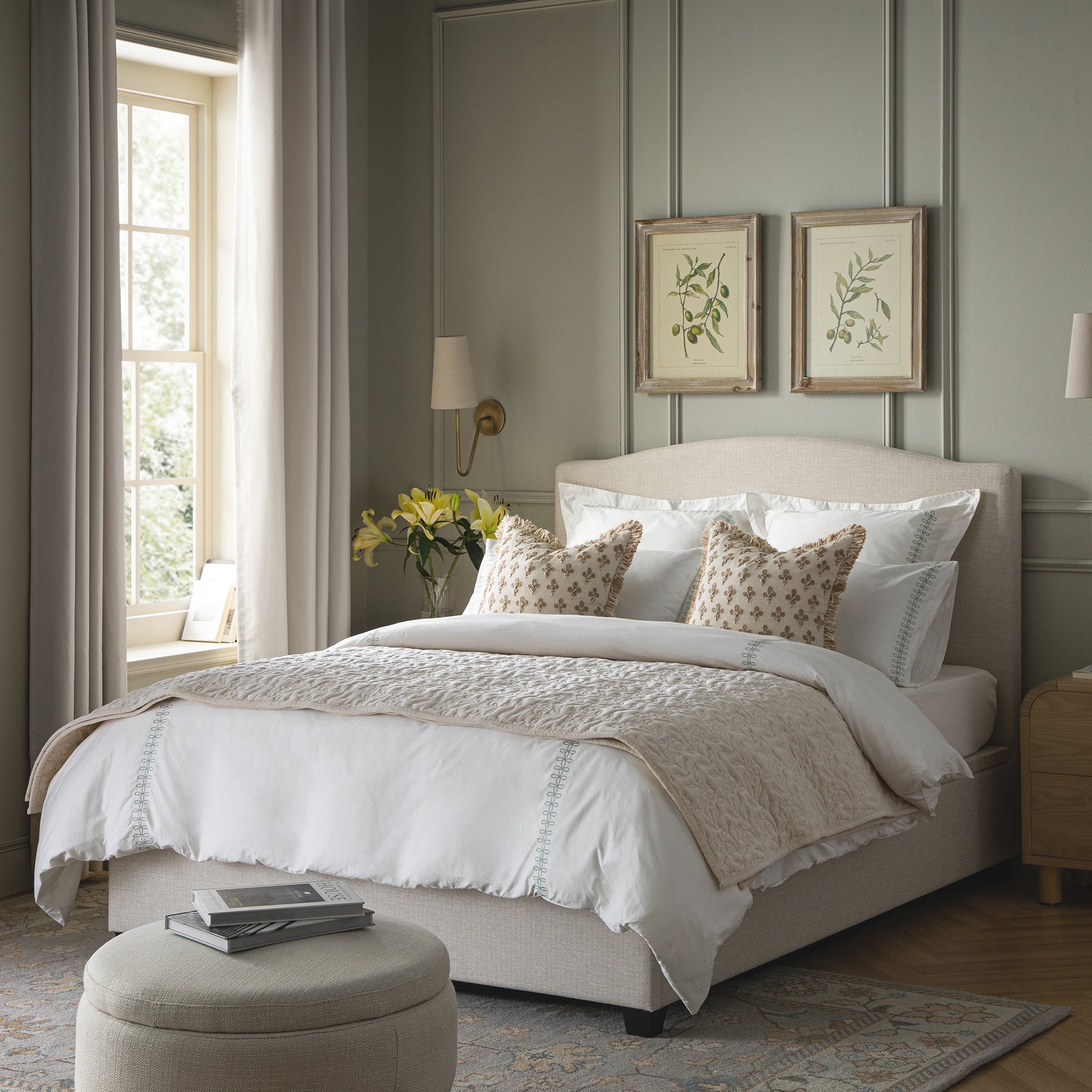 Complete the look: Pictured with the Chilworth Ivory Upholstered Ottoman Storage Bed is our Amboise Beige Round Storage Pouffe, Maison Neutral Betsy Jute Floral Fringed Cushion, Maison Cream Floral Quilted Velvet Bedspread, Milano Glacier Grey Knot Embroidered Duvet Set and Continental Square Pillowcases, Heritage Florentine Ice Blue Premium Hand-Knotted New Zealand Wool Rug and Maude Natural Ash Bedside Table.