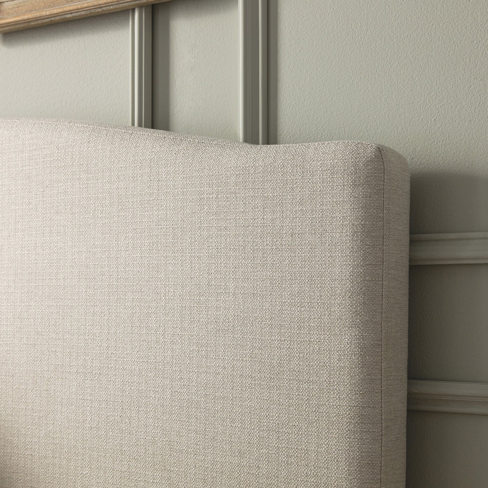 - Upholstered in a textured ivory weaved fabric, its gently arched headboard adds a subtle curve to the silhouette, offering just the right touch of character while keeping the overall look clean and quietly sophisticated.