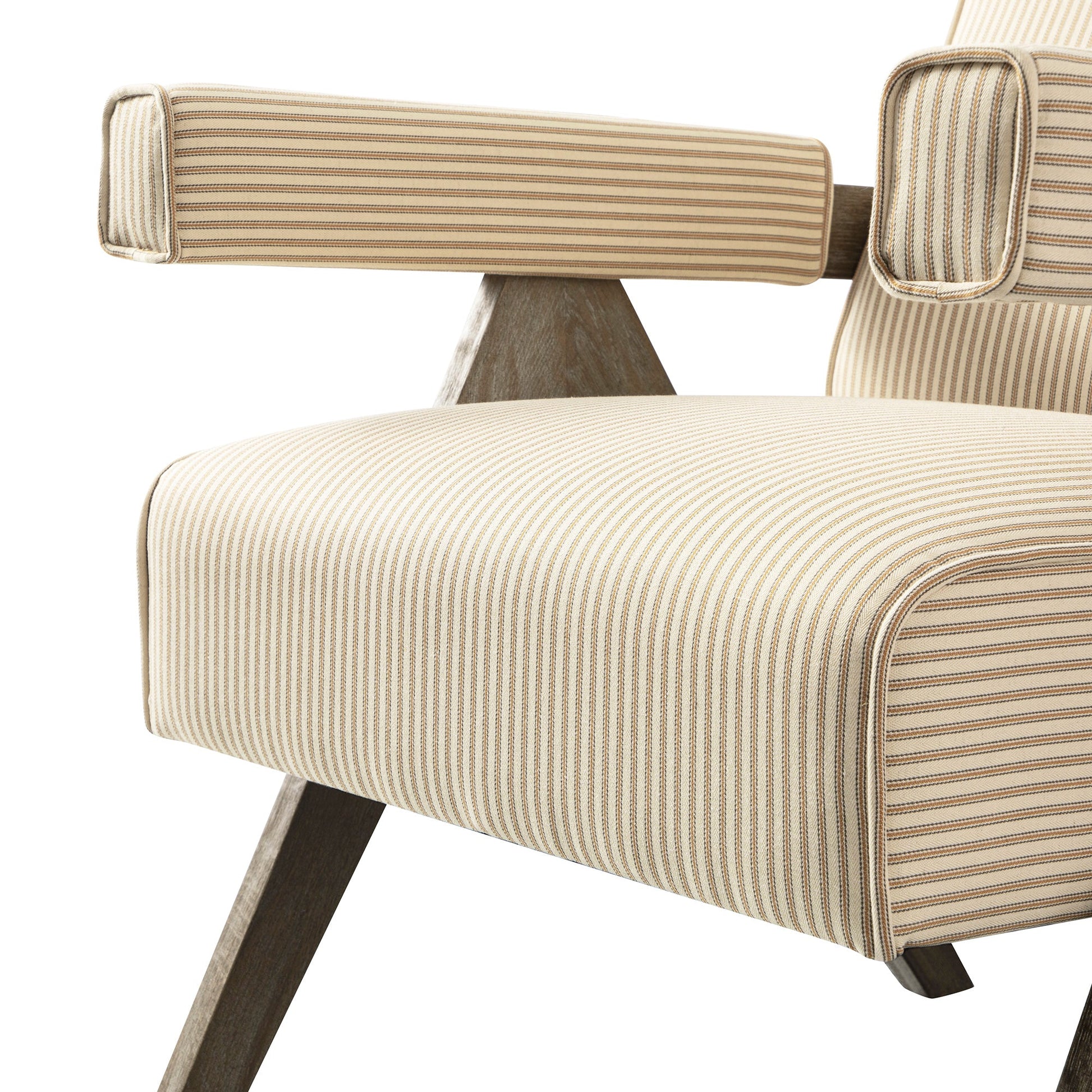 - Well-cushioned in seat, back and arm and upholstered in beautiful ochre striped linen blend fabric, the chair is finished with a solid oak frame with weathered finish.