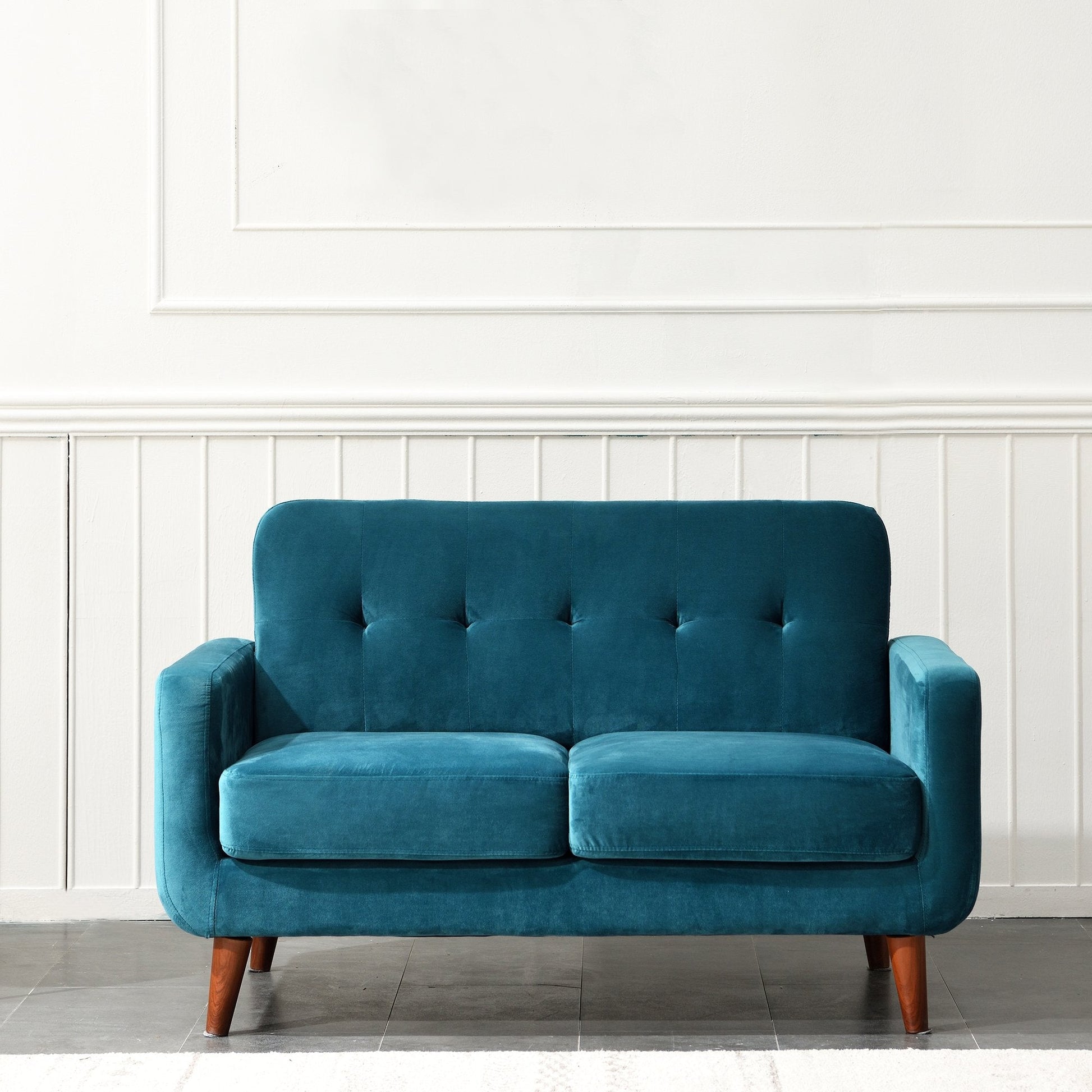 - Upholstered with soft velvet effect fabric in beautiful colours, the sofa comes with tufted backrest and sits on tapered legs. The well proportioned backrest and thick seat cushions offer a comfortable and supportive sitting experience.