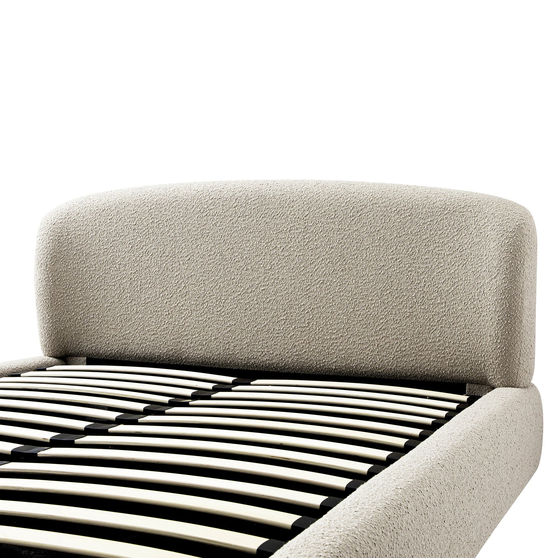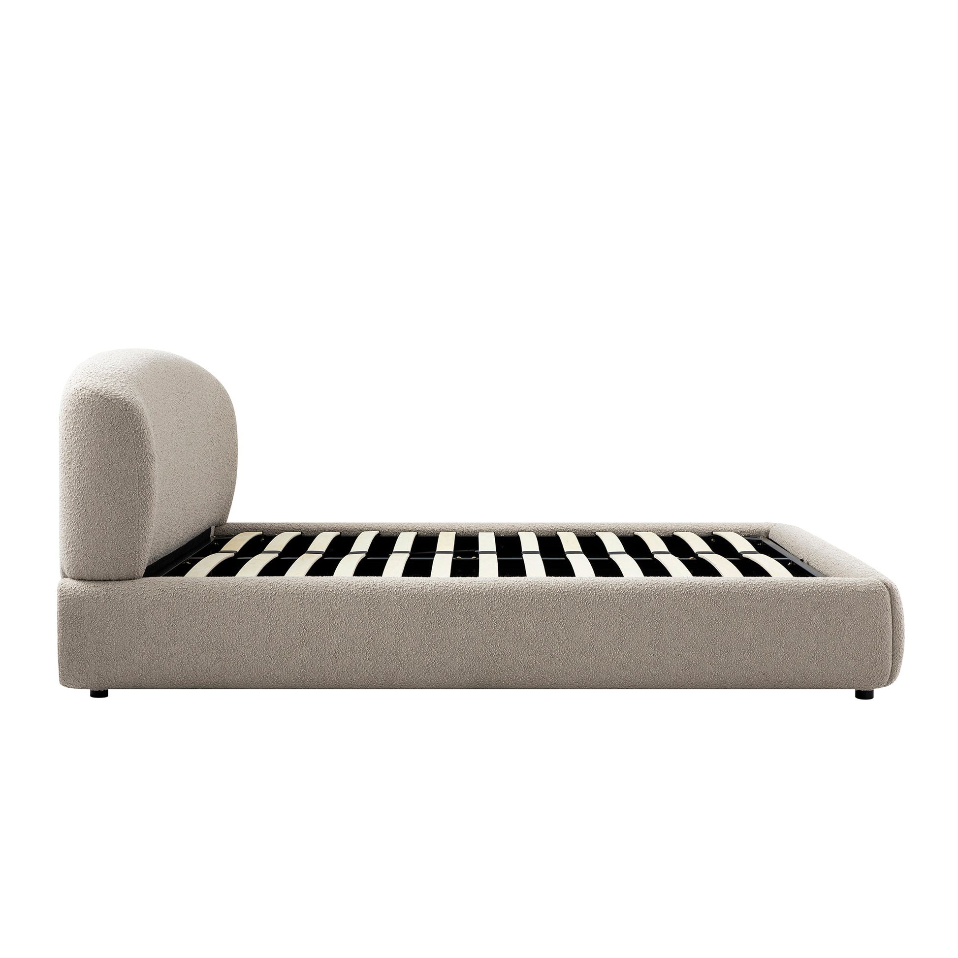 - Plushly padded from head to end, the bed is upholstered in beautiful textured boucle fabric in light taupe colour, including the back of headrest.