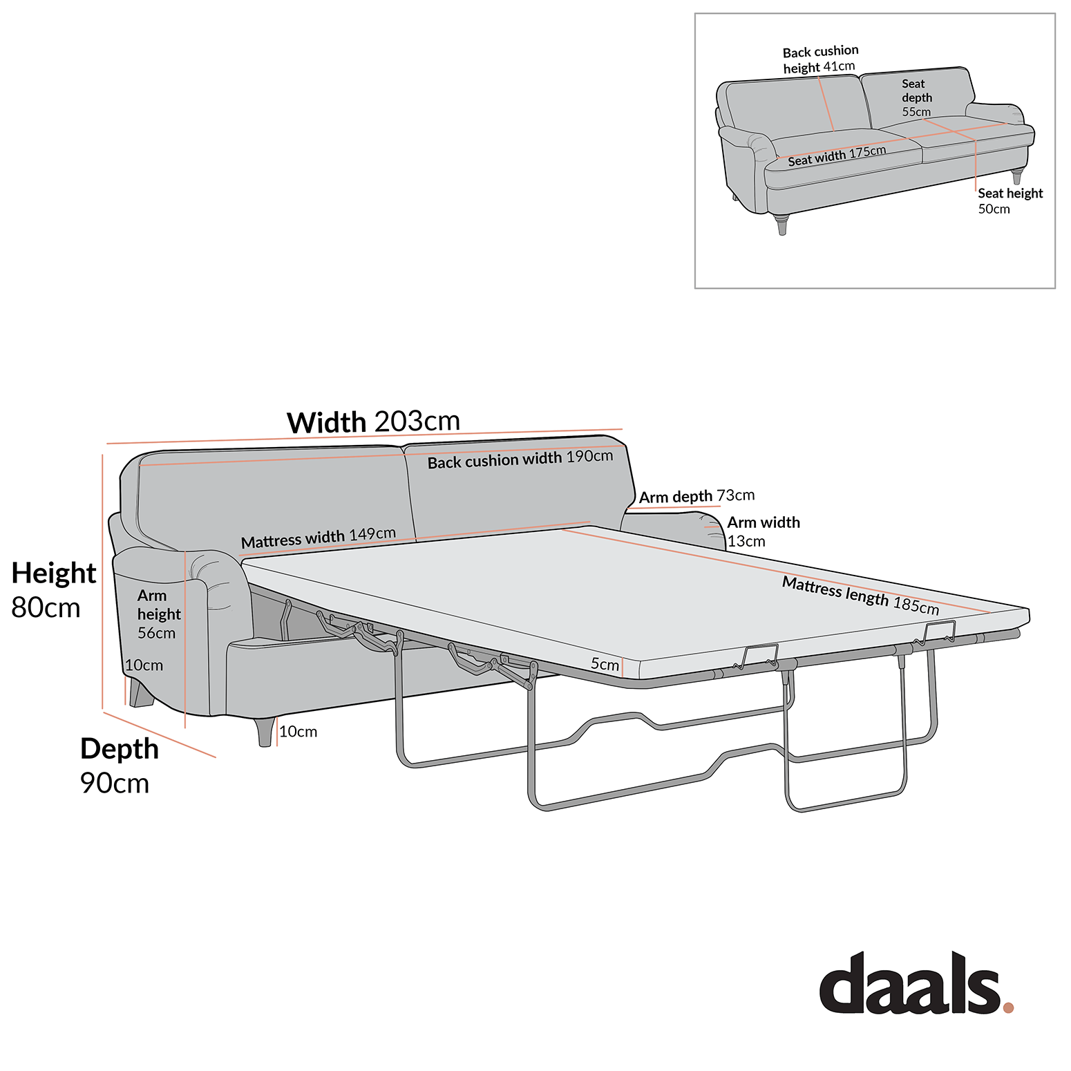 - By day, it serves as a generously sized 3-seater sofa with supportive back cushions, and timeless rolled arms. By night, it transforms into a sofa bed, providing a convenient sleep solution for family or overnight guests.
