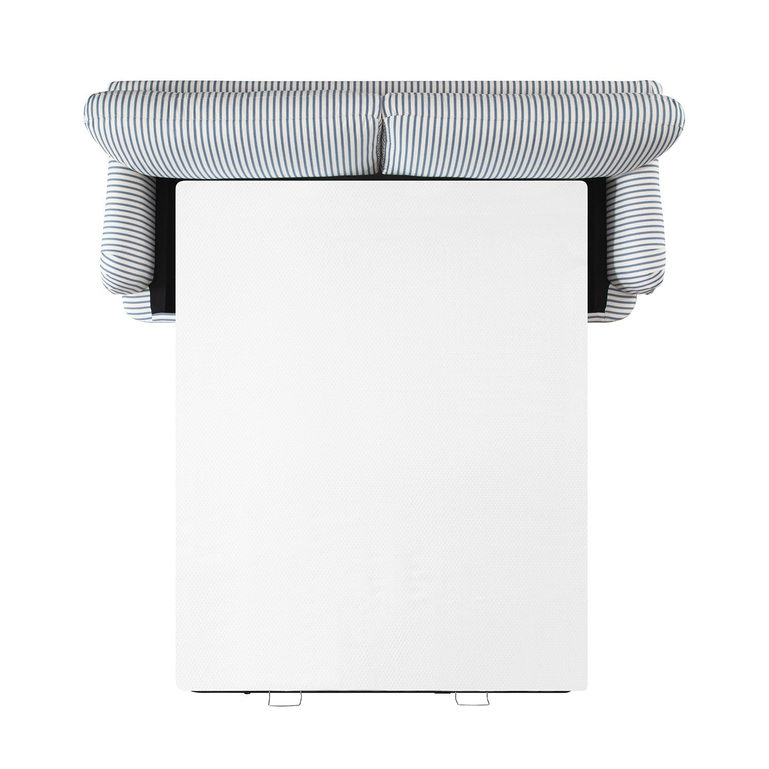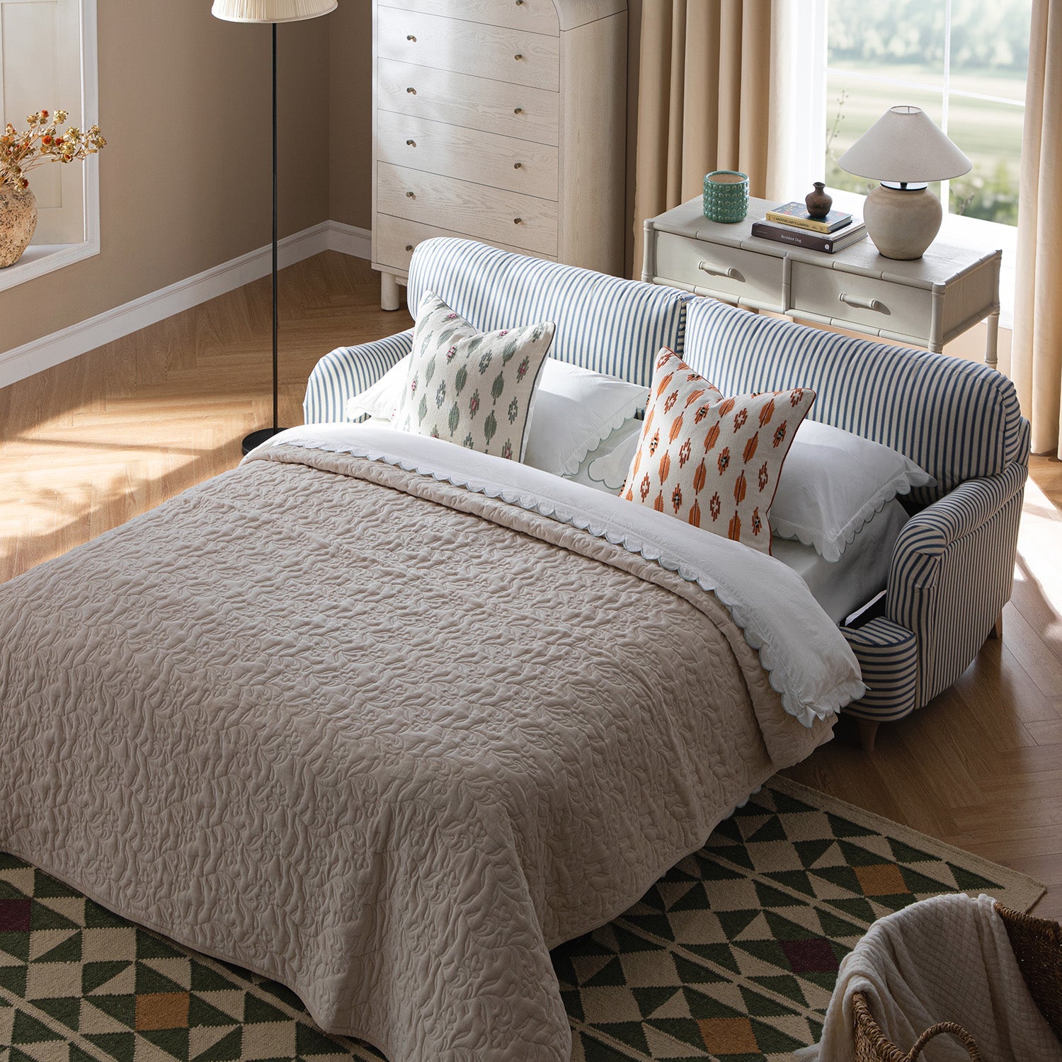 - Complete the look: Pictured with the Daphnis Blue Striped Sofa Bed is our Kamala Geometric Handwoven Wool Rug, Maison Cream Floral Quilted Cotton Velvet Bedspread, Margot Pistachio Green Embroidered Scallop Duvet Set, Maude Washed White Ash Tall Chest, Elstowe Shaded White Faux Bamboo Console Table and Patola Ikat French Knot Linen Cushion in slate blue and orange.