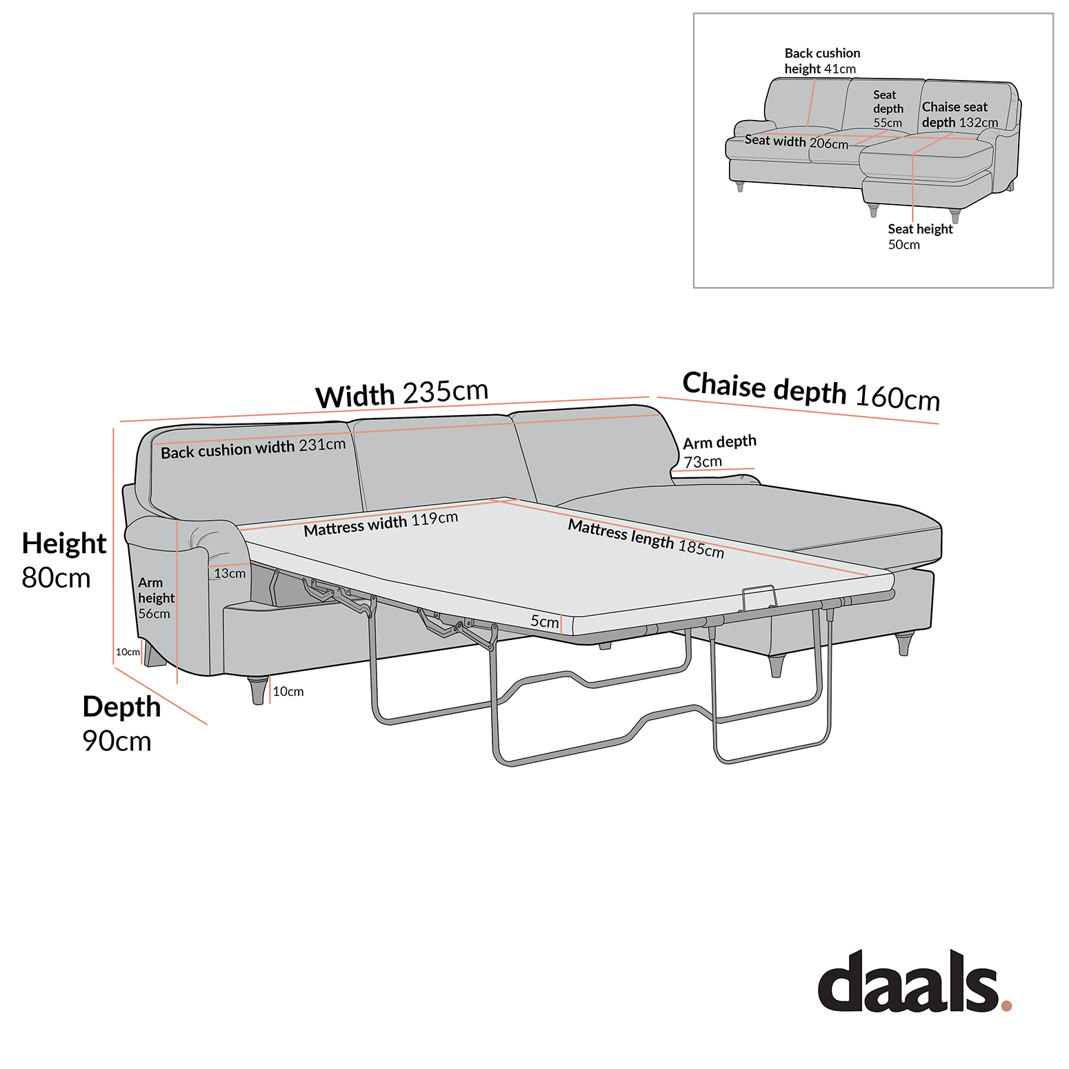 - Grande chaise sofa bed size: W 235 x D 160 x H 80 cm.