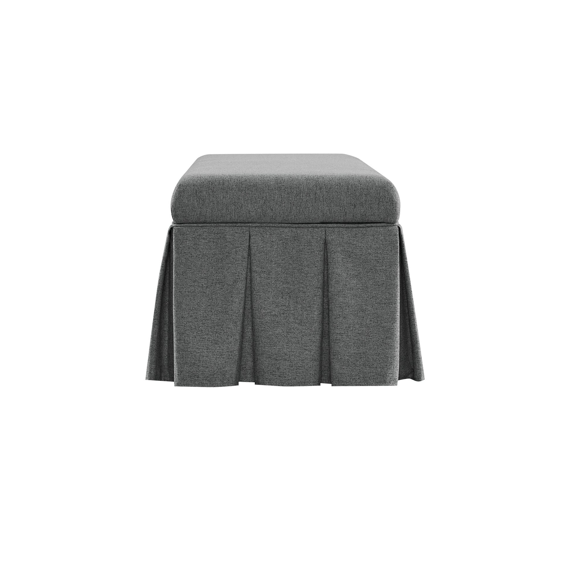 - The crisp box-pleat skirt lends a structured silhouette, echoing the charm of traditional upholstered furniture while neatly disguising its hidden storage within.