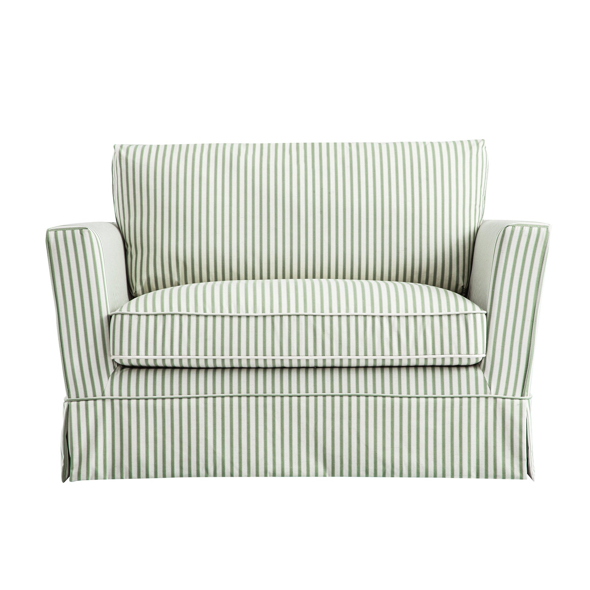 - Elegant and inviting, The Fitz Skirted Loveseat in sage stripe balances heritage style with easy, everyday comfort—perfect for those who love their classics with a fresh twist.