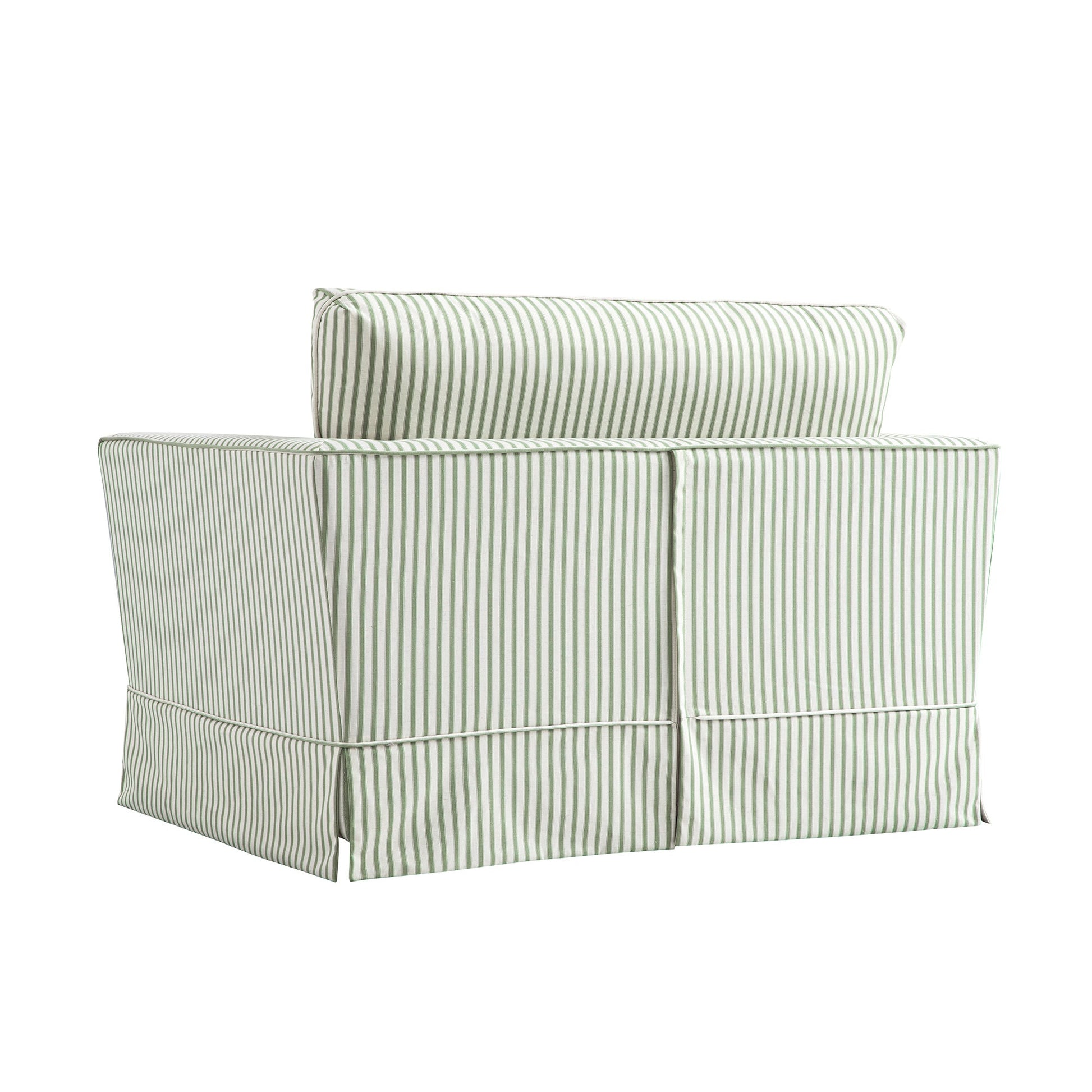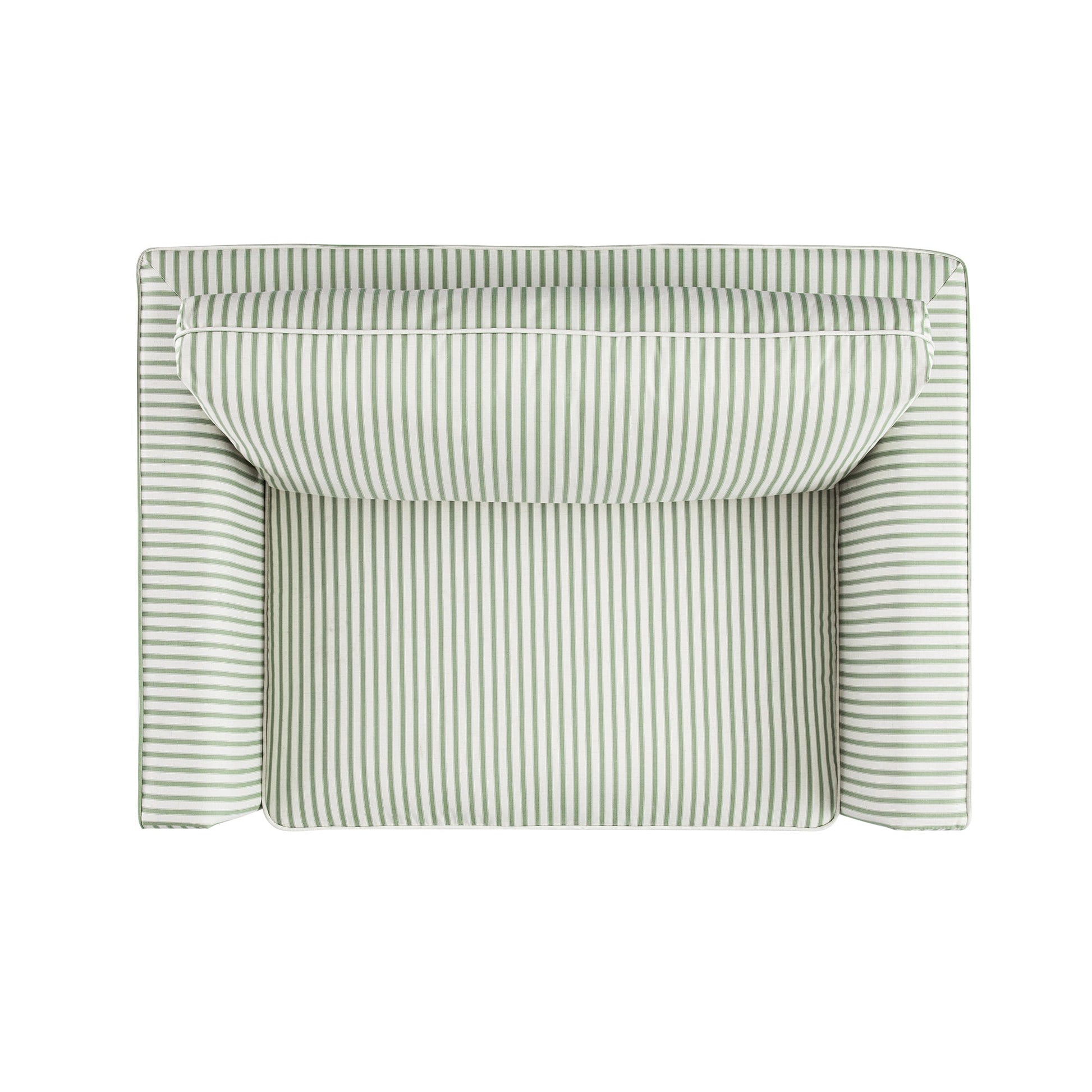 - Upholstered in a soft linen-blend fabric with classic sage green and ivory ticking stripes, it adds a gentle rhythm to any room—elegant without trying too hard, and effortlessly soothing to the eye.