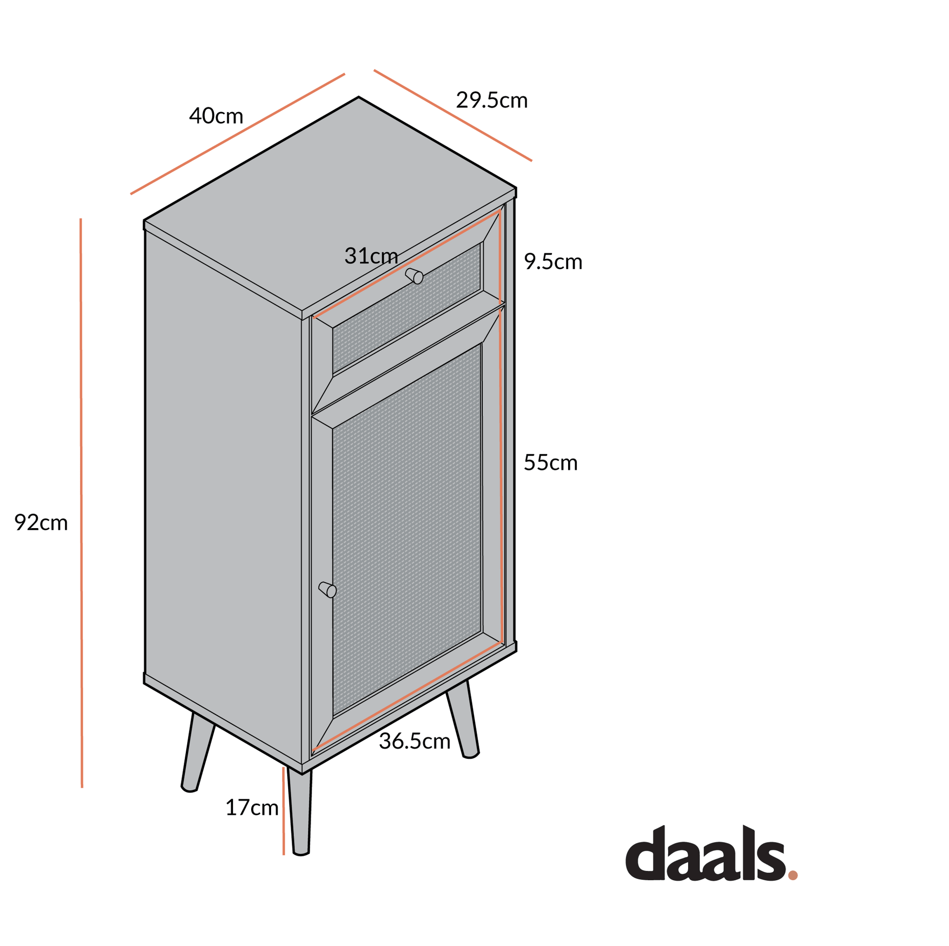 - The cabinet has shelved storage behind the rattan front door, as well as a sliding drawer