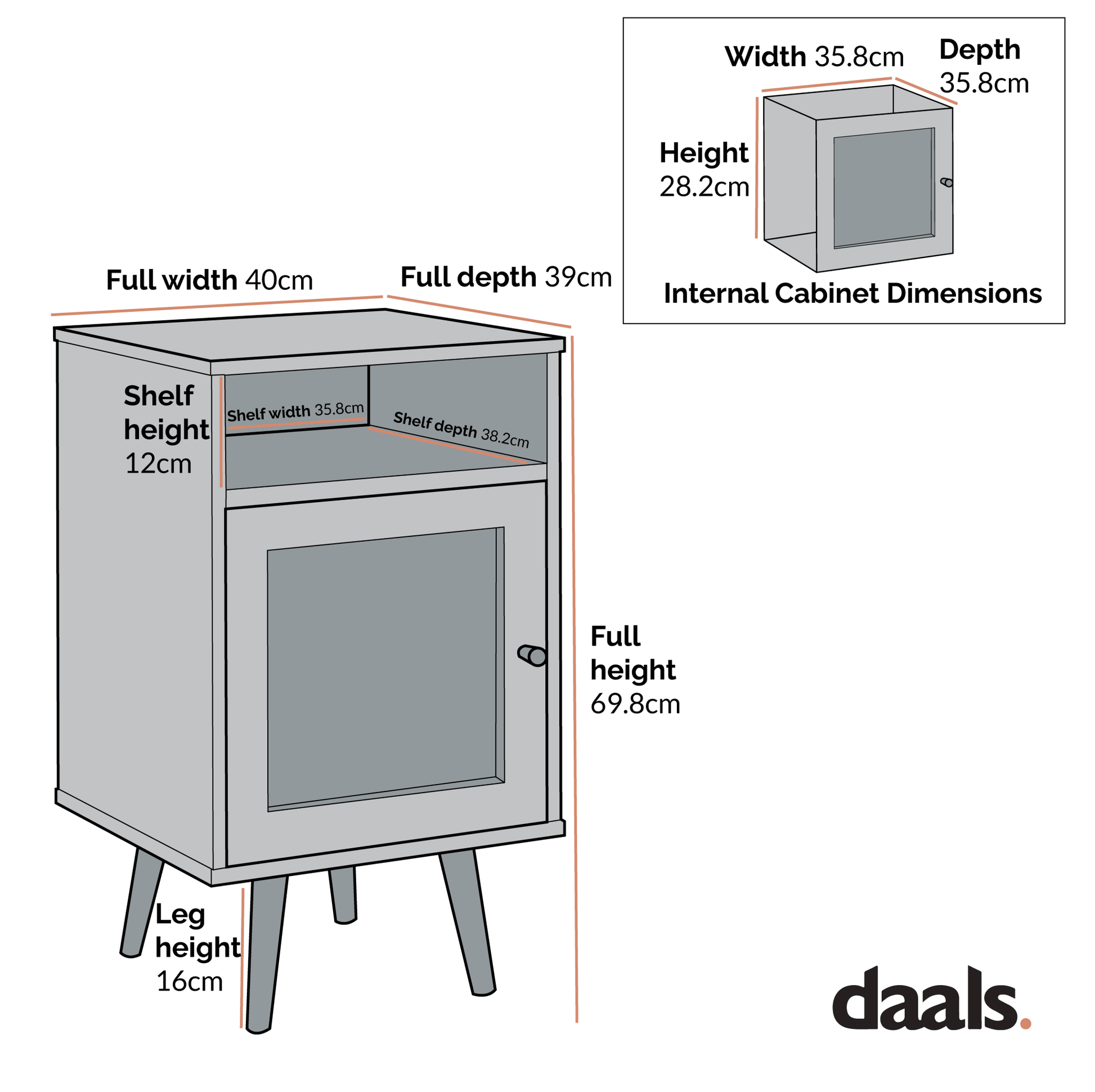 - The table offers plenty of room to sort bedroom accessories with 1-door cabinet and one open shelf.