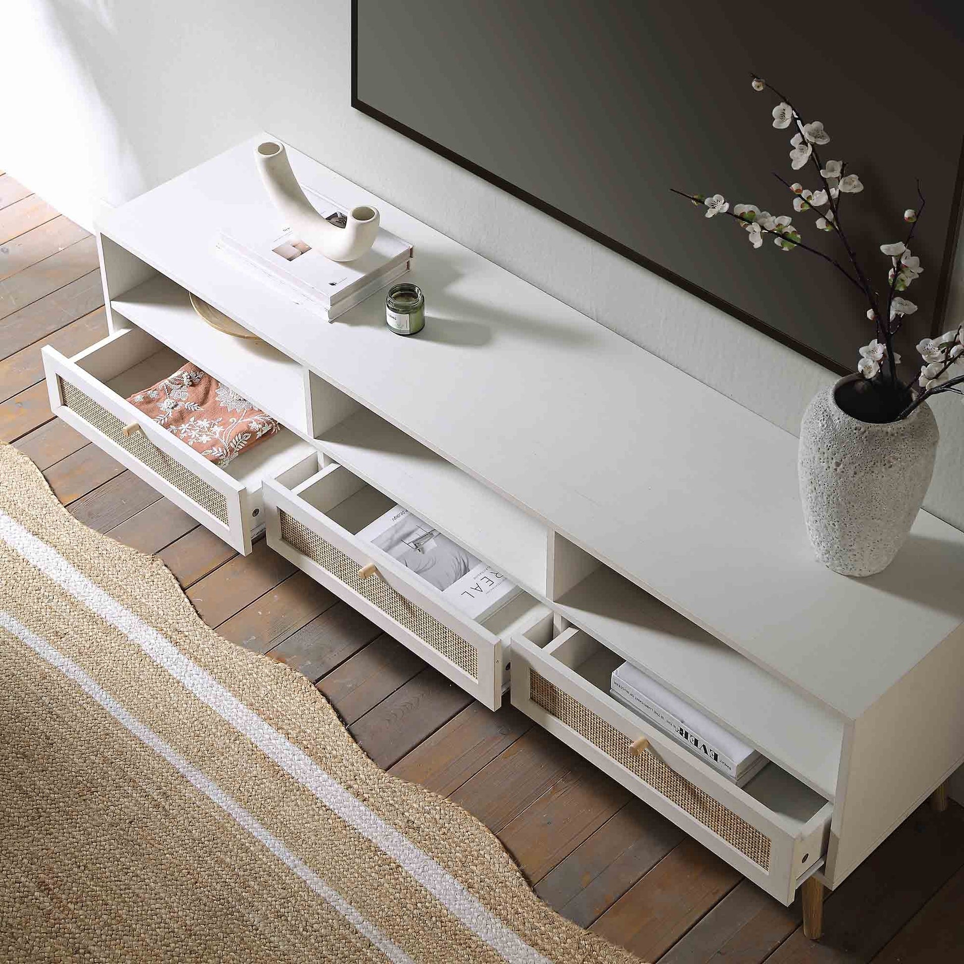 Frances Woven Rattan 160cm 3-Drawer TV Unit, White