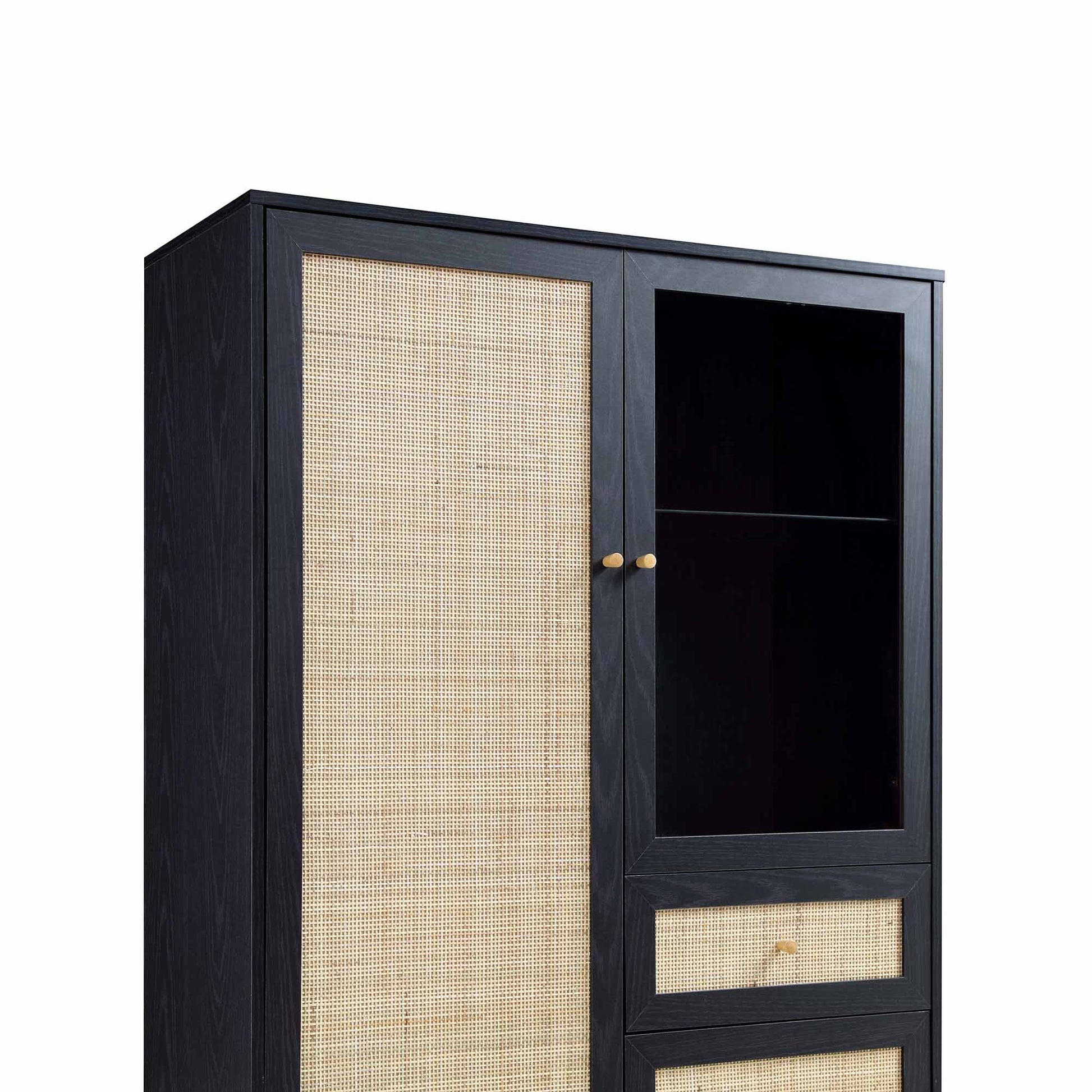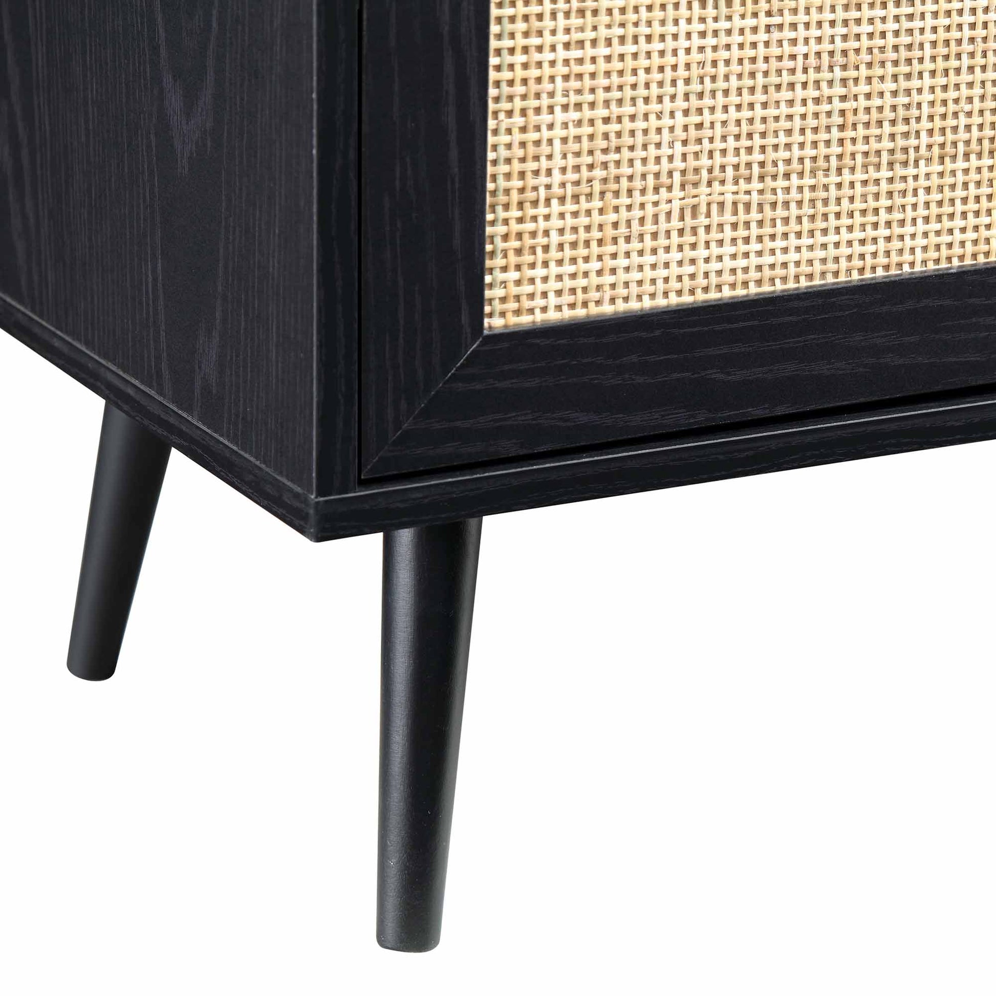 - Hand woven natural rattan inserts on the cabinet door and drawer font coordinate with solid wood handle and legs to create a cosy, earthy look.