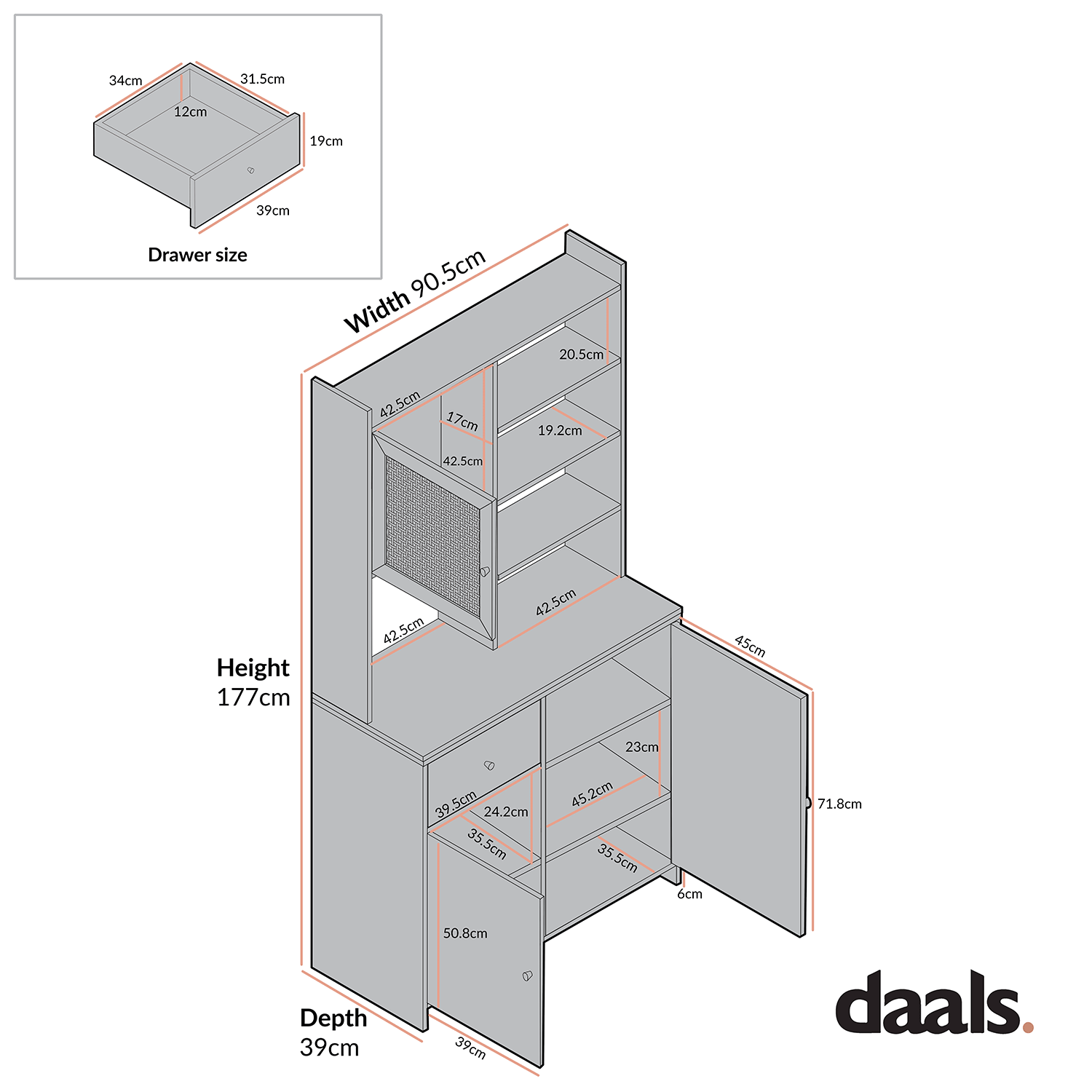 - Top left cupboard size: W 42.5 x D 17 x H 42.5 cm