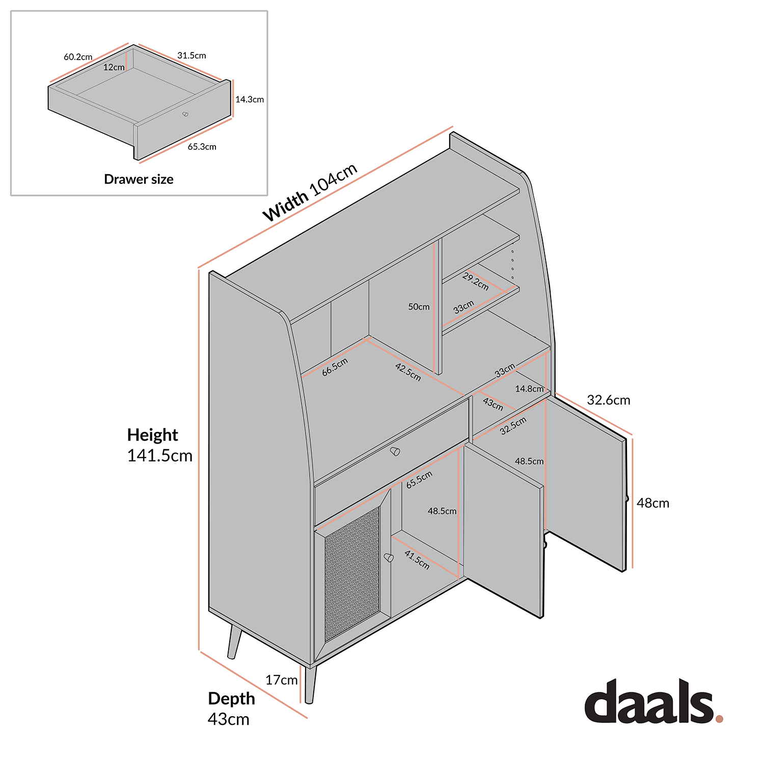 - Top left shelf size: W 66.5 x D 42.5 x H 50 cm