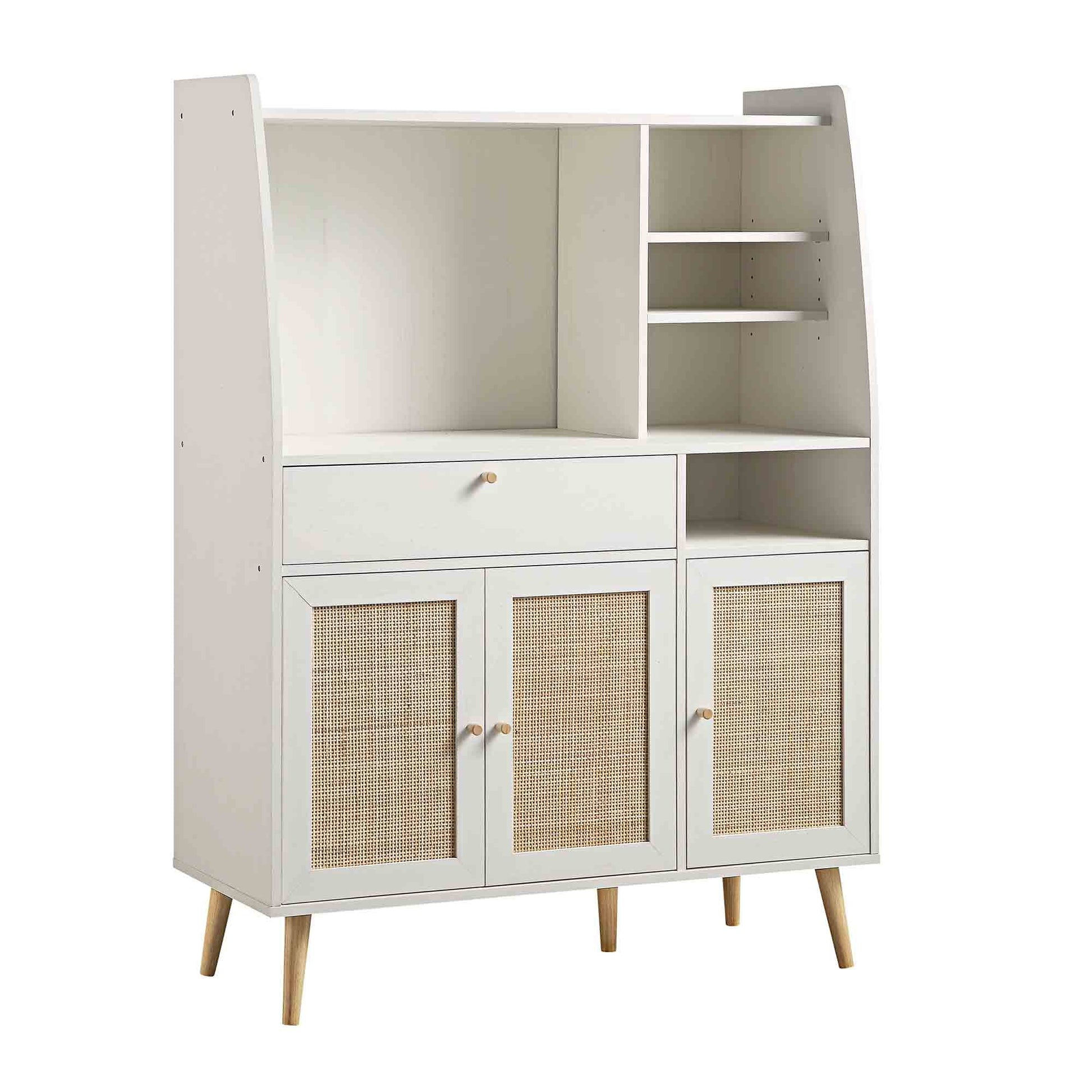 - With a range of multi-level shelves perfect for displaying glasses and small appliances, this highly functional Frances Kitchen Cabinet also comes with a drawer and closed cabinet space. The hand-woven natural rattan door fronts perfectly coordinate with the solid wood handles.
