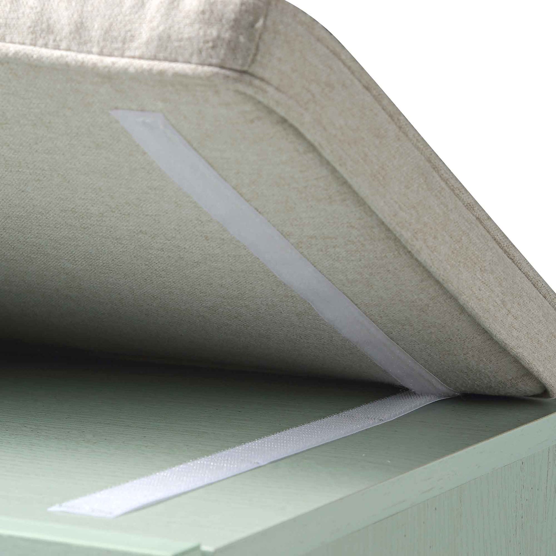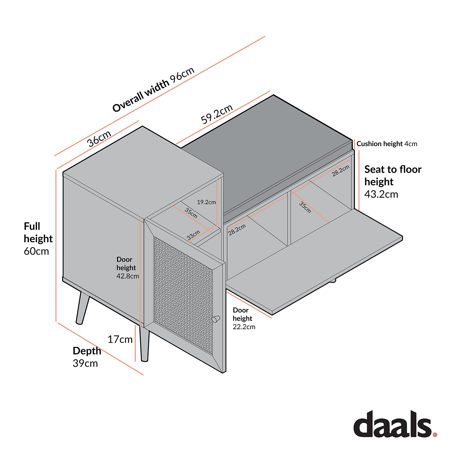 - The natural woven rattan fronts are complemented by oatmeal fabric cushion, which is attached to the bench conveniently with Velcro strips.