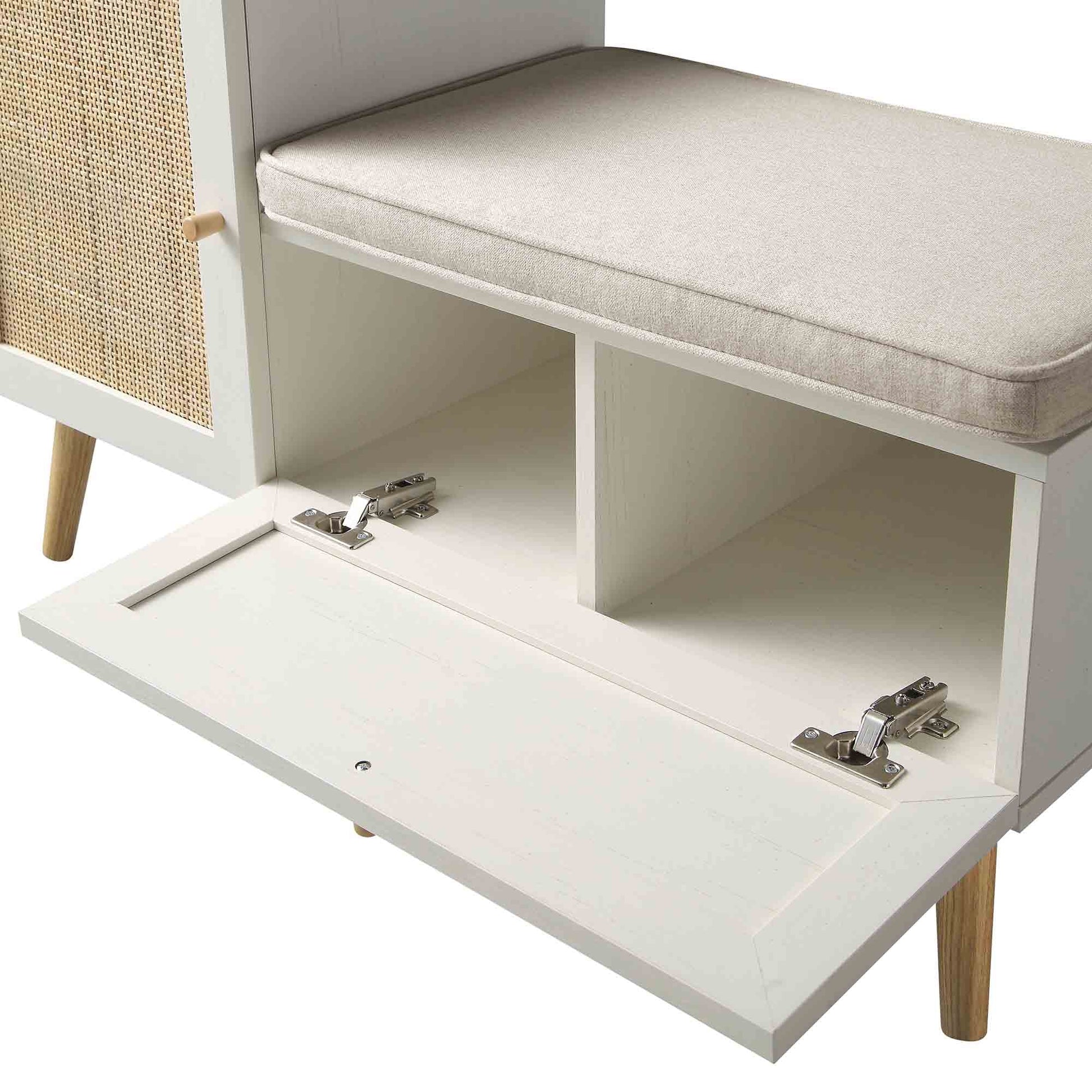 - The natural woven rattan fronts are complemented by oatmeal fabric cushion, which is attached to the bench conveniently with Velcro strips.
