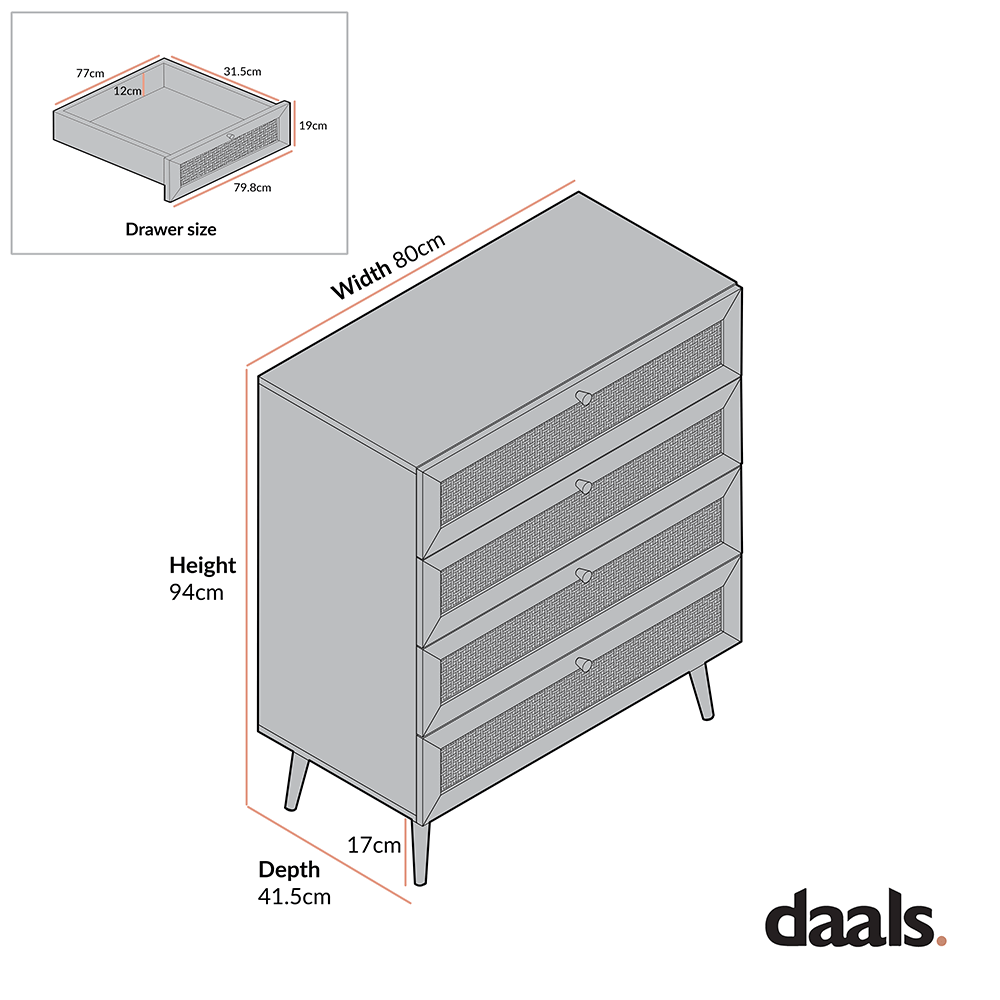 - This beautiful chest comprises of four spacious drawers, sliding drawers with a rattan drawer front and solid wood handles