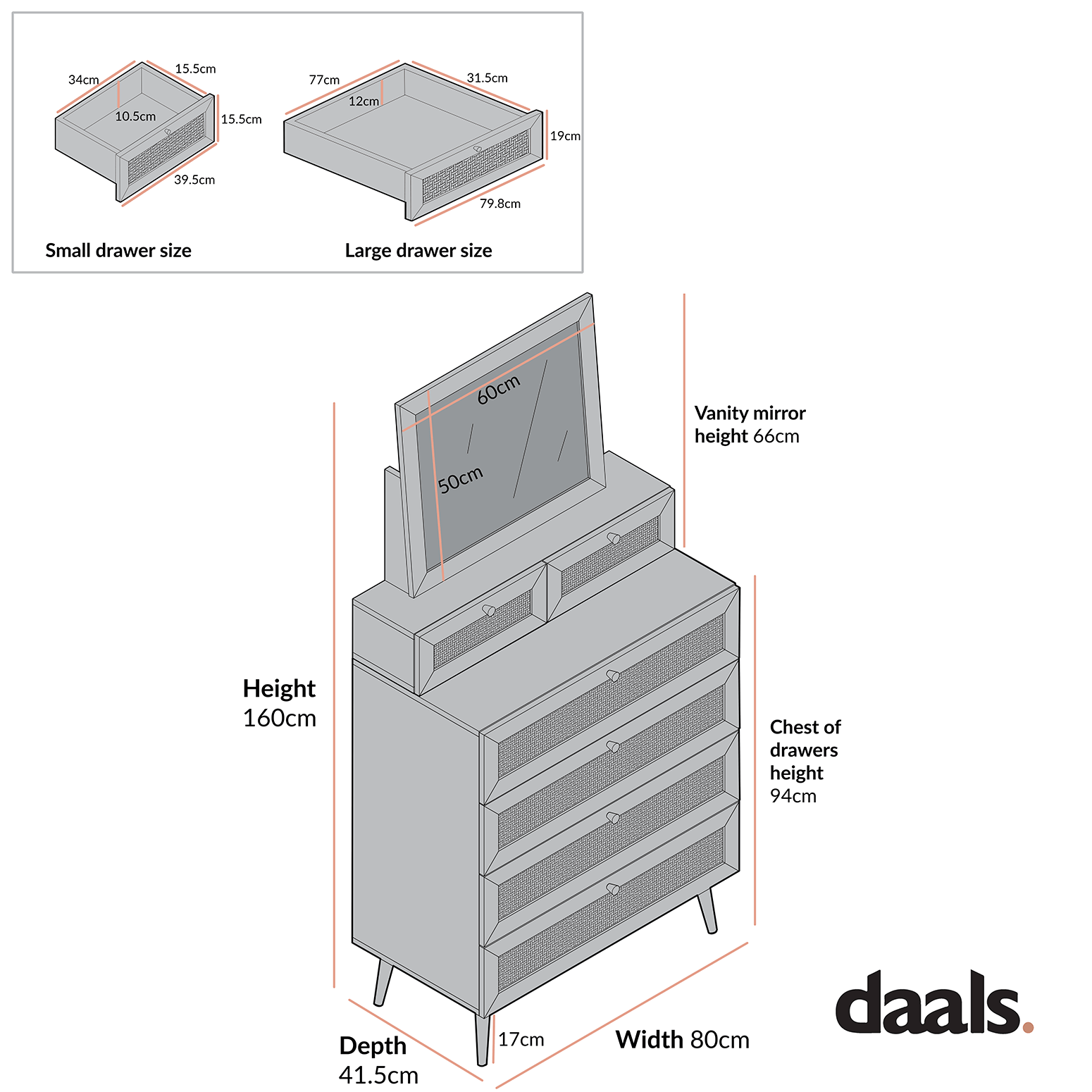 - Vanity mirror drawer internal size: W 34.0 x D 15.5 x H 10.5 cm