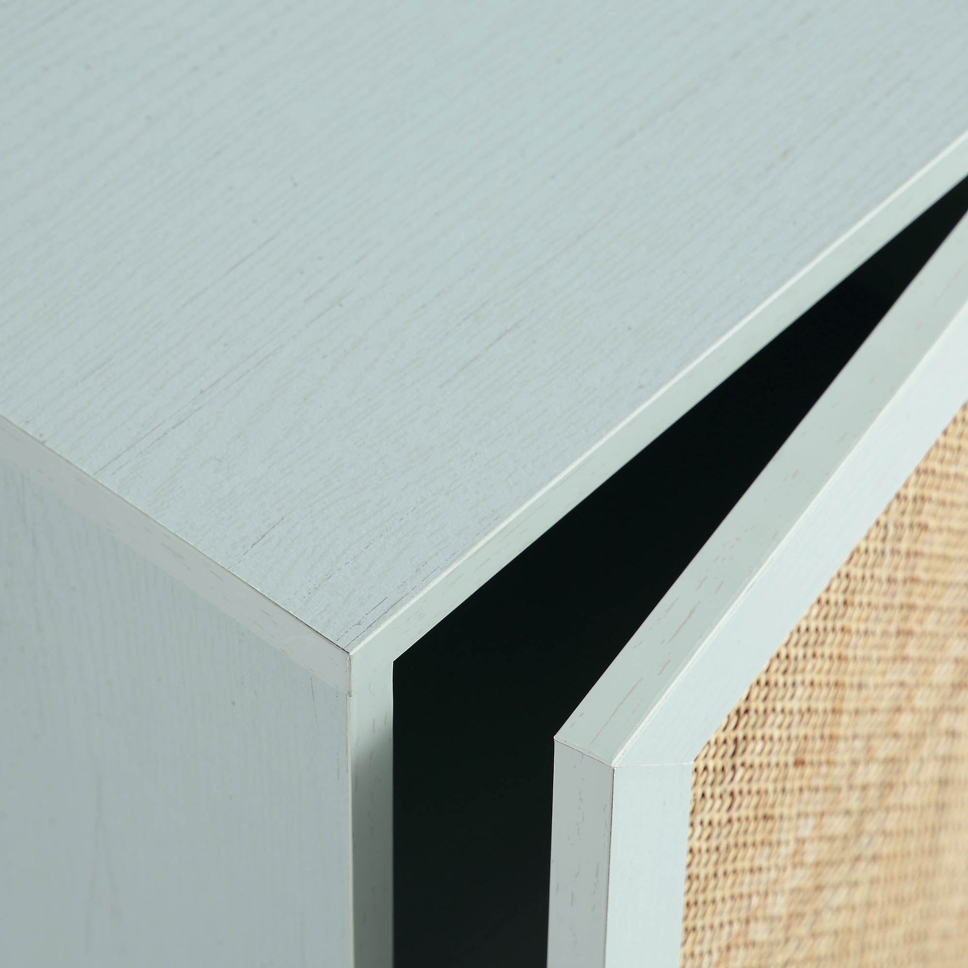 - The rattan doors and drawer are completed with a solid wood handle, adding to the minimalist nature of the unit