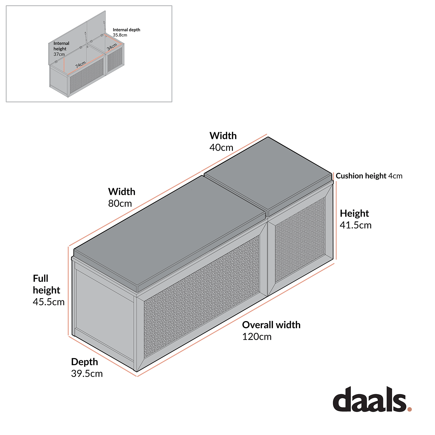 - Internal storage space of single unit: W 34 x D 35.8 x H 37. cm