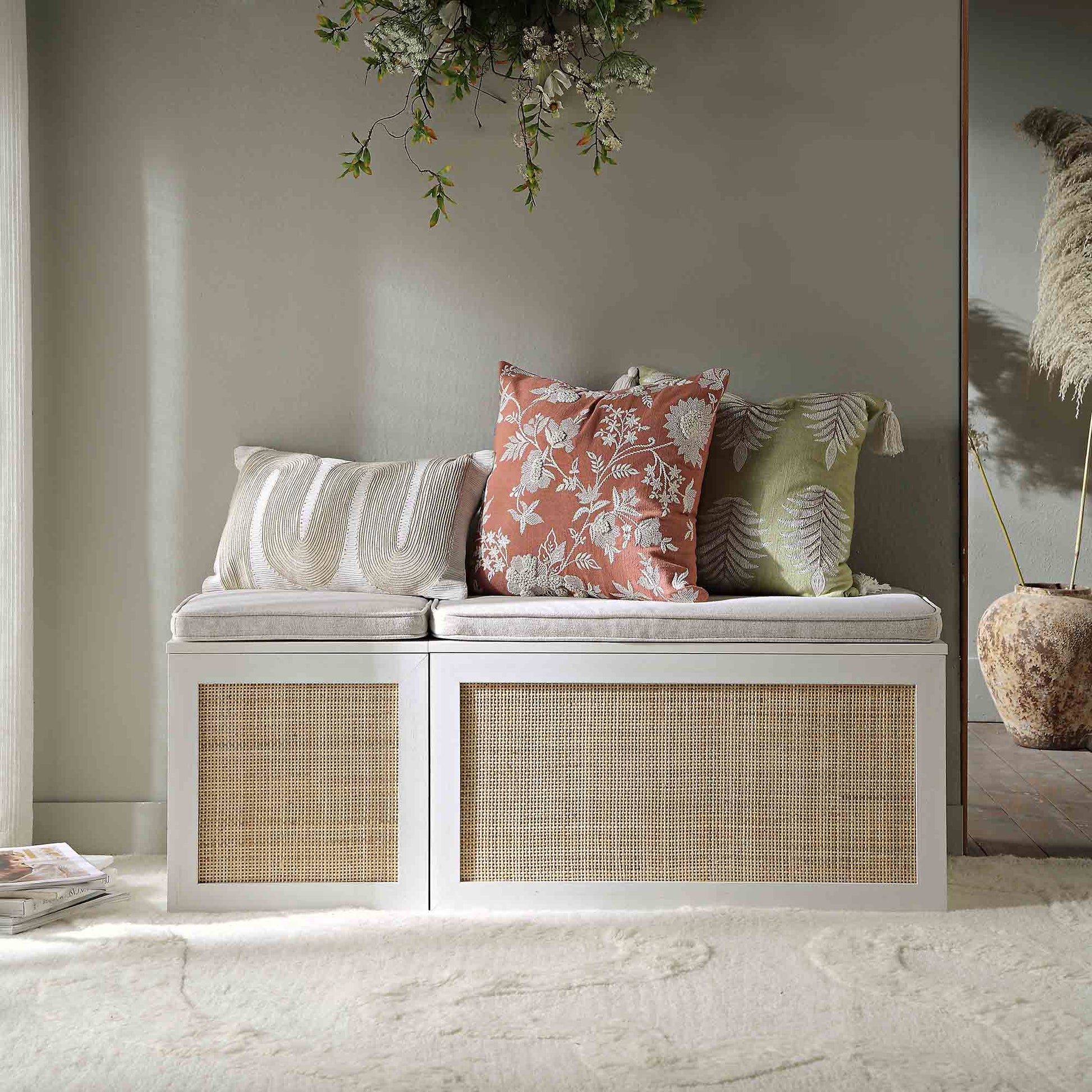- Complete the look: Pictured with our Frances Woven Rattan Triple Storage Stool is our Mirage Hand Tufted New Zealand Wool Rug, Luxe Collection Odilla Sparkle Cord Cushion, Aubrey Collection Floral Cushion and our Vine Collection Green Palms Cushion