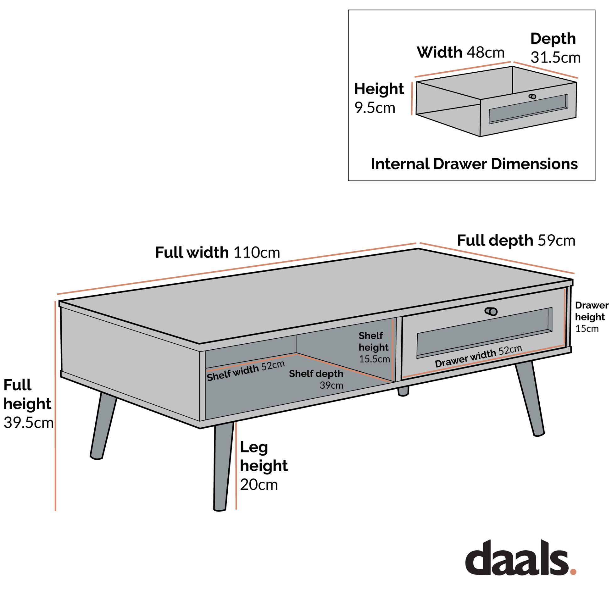 - The coffee table offers 1 sliding drawer and 1 open shelf for storage.