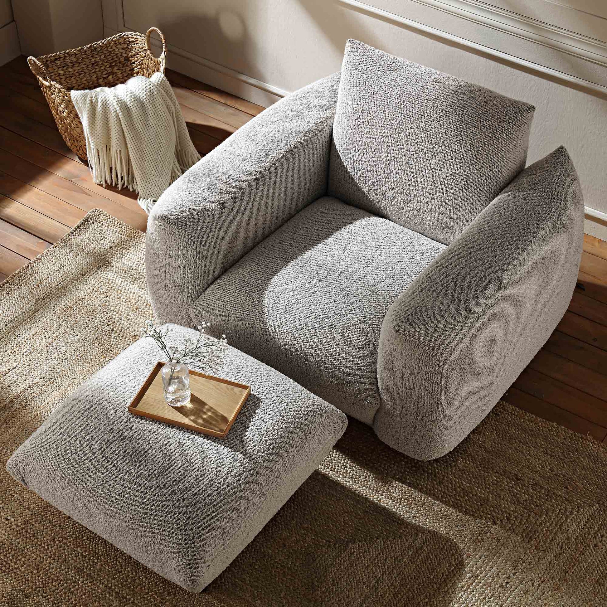 - Upholstered with chic mist grey boucle fabric for a contemporary look.