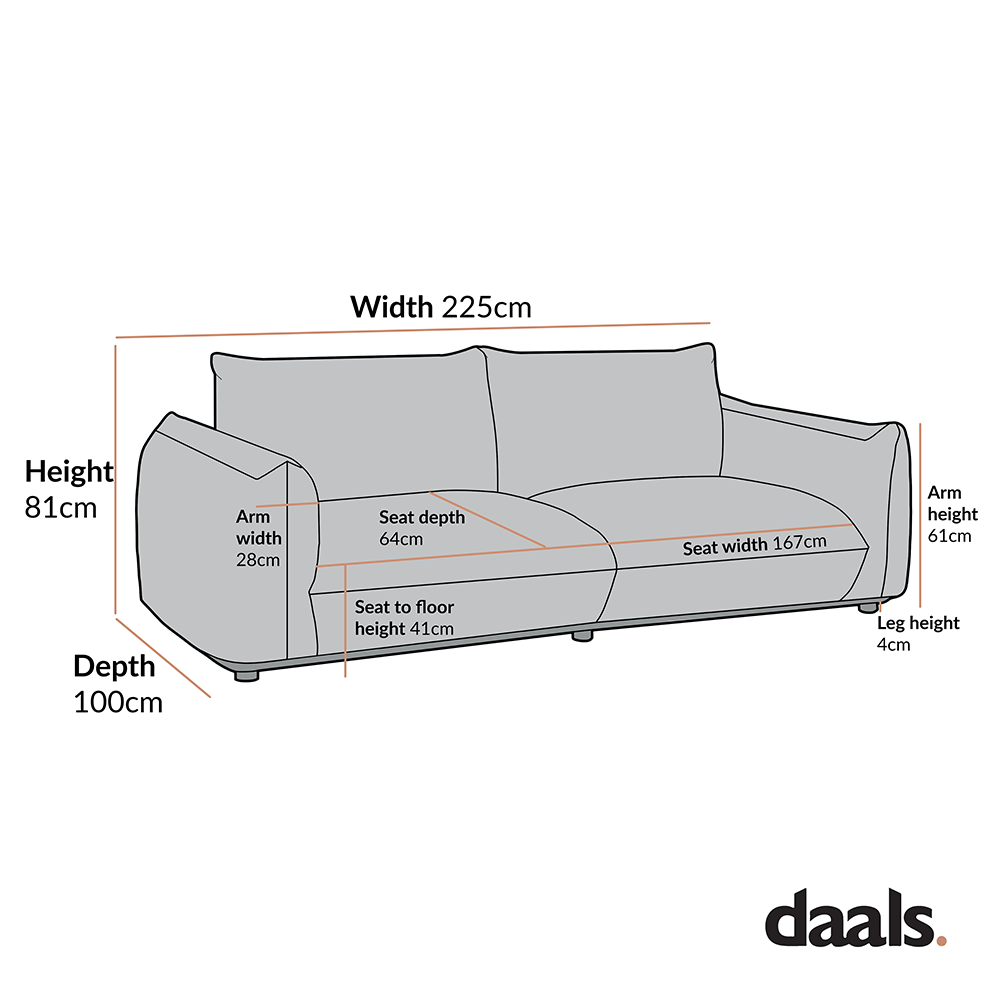 - Three seater sofa size: W 225 x D 101 x H 81 cm.