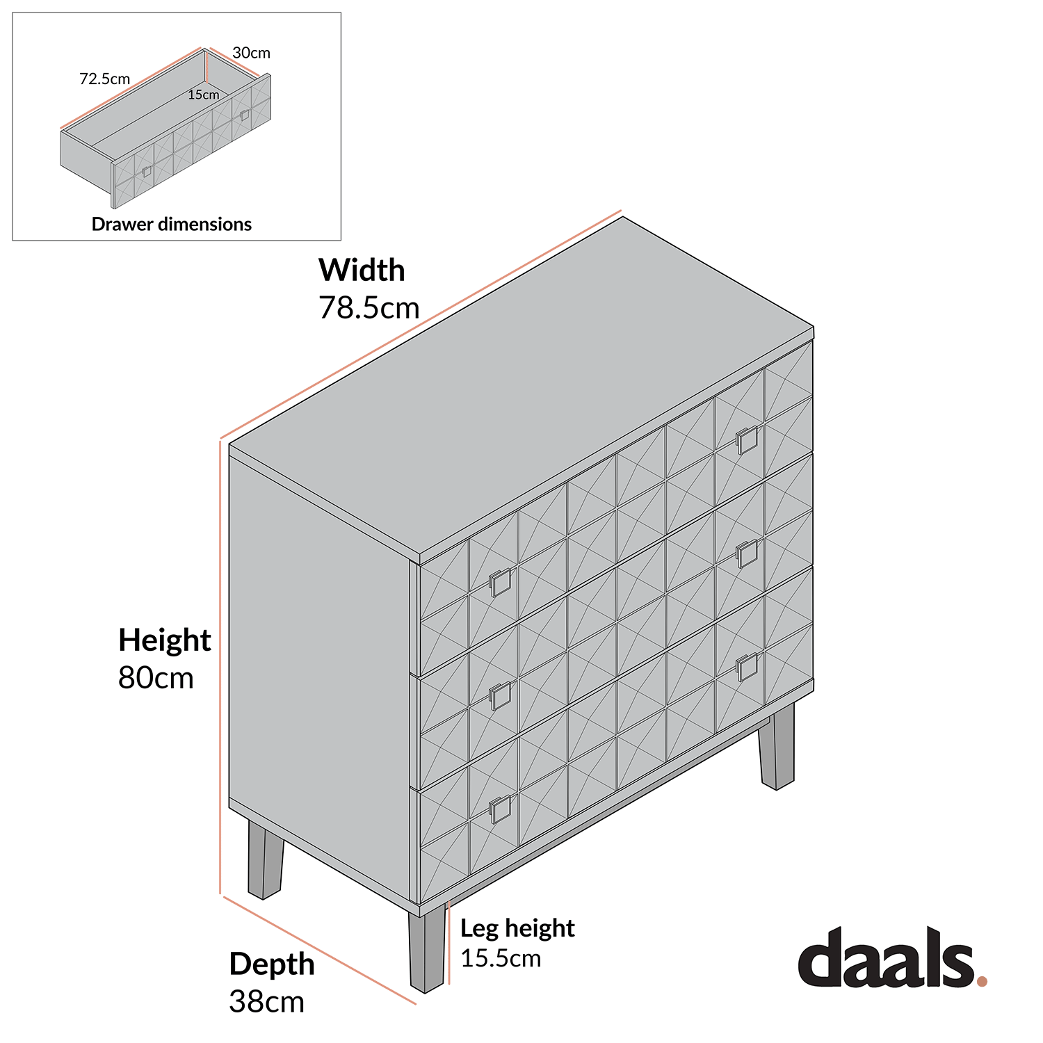 - Drawer internal storage size: W 72.5 x D 30 x H 15 cm
