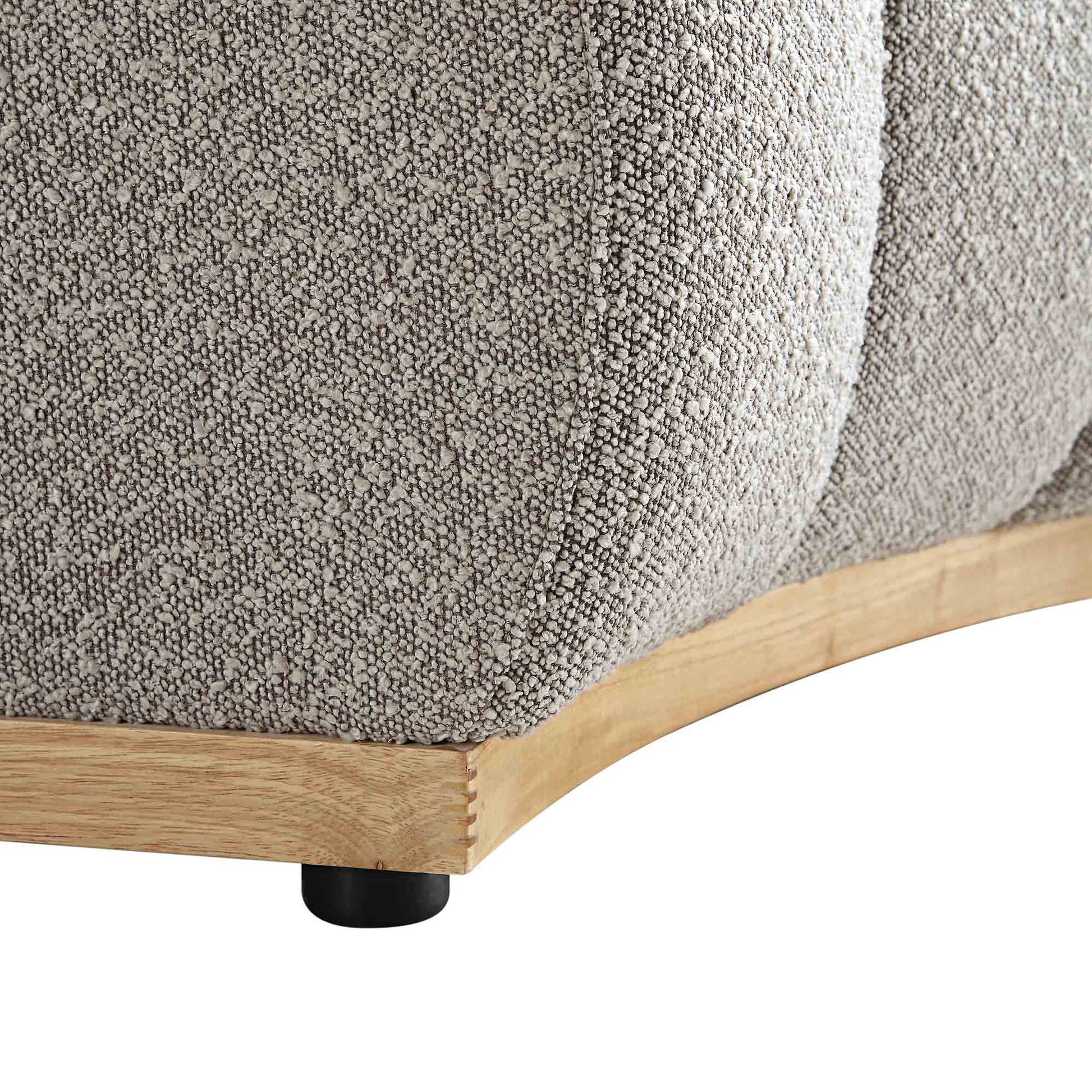 - Upholstered with beautiful taupe boucle fabric, the sofa modules are mounted on natural solid wood bases.