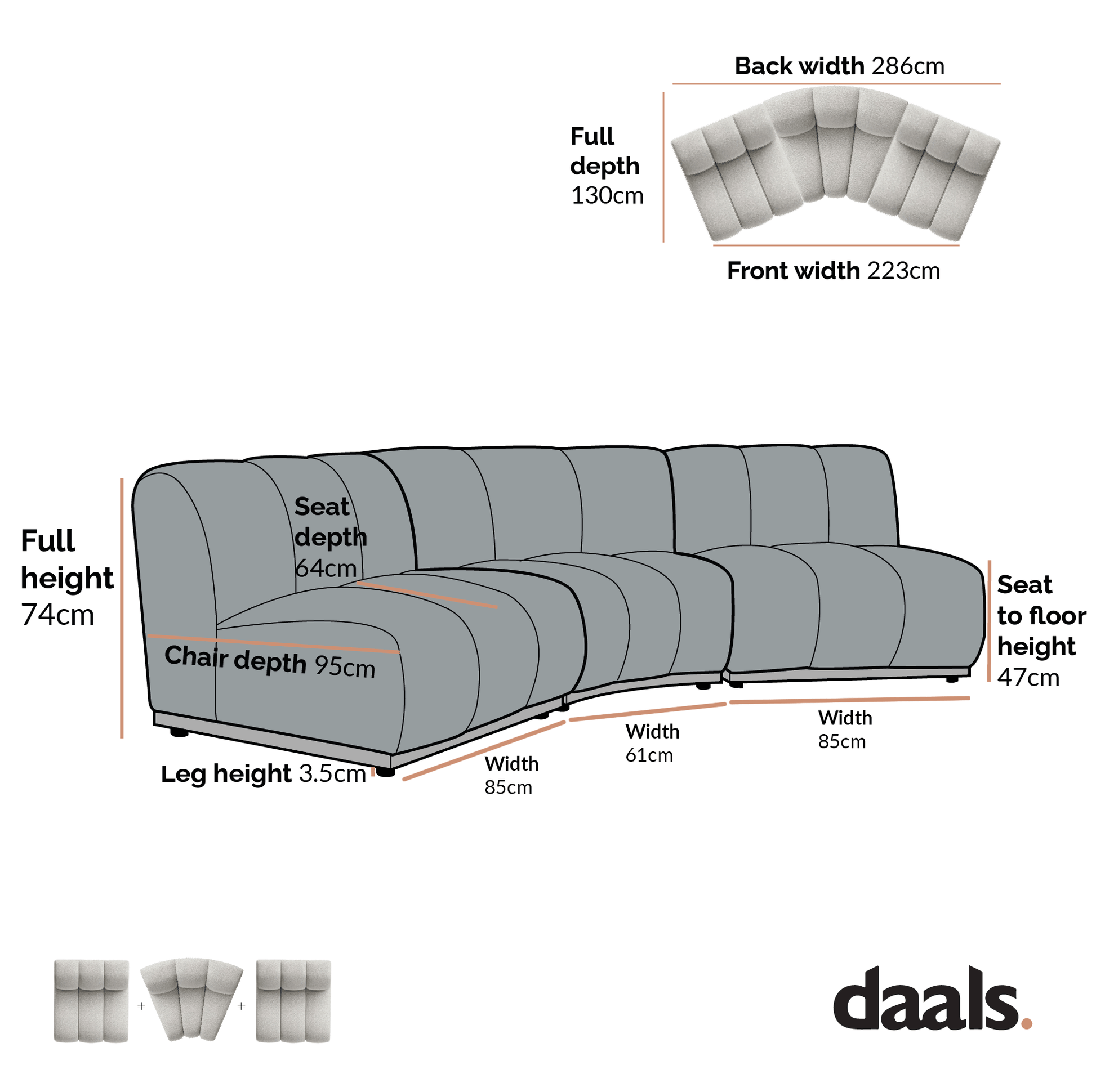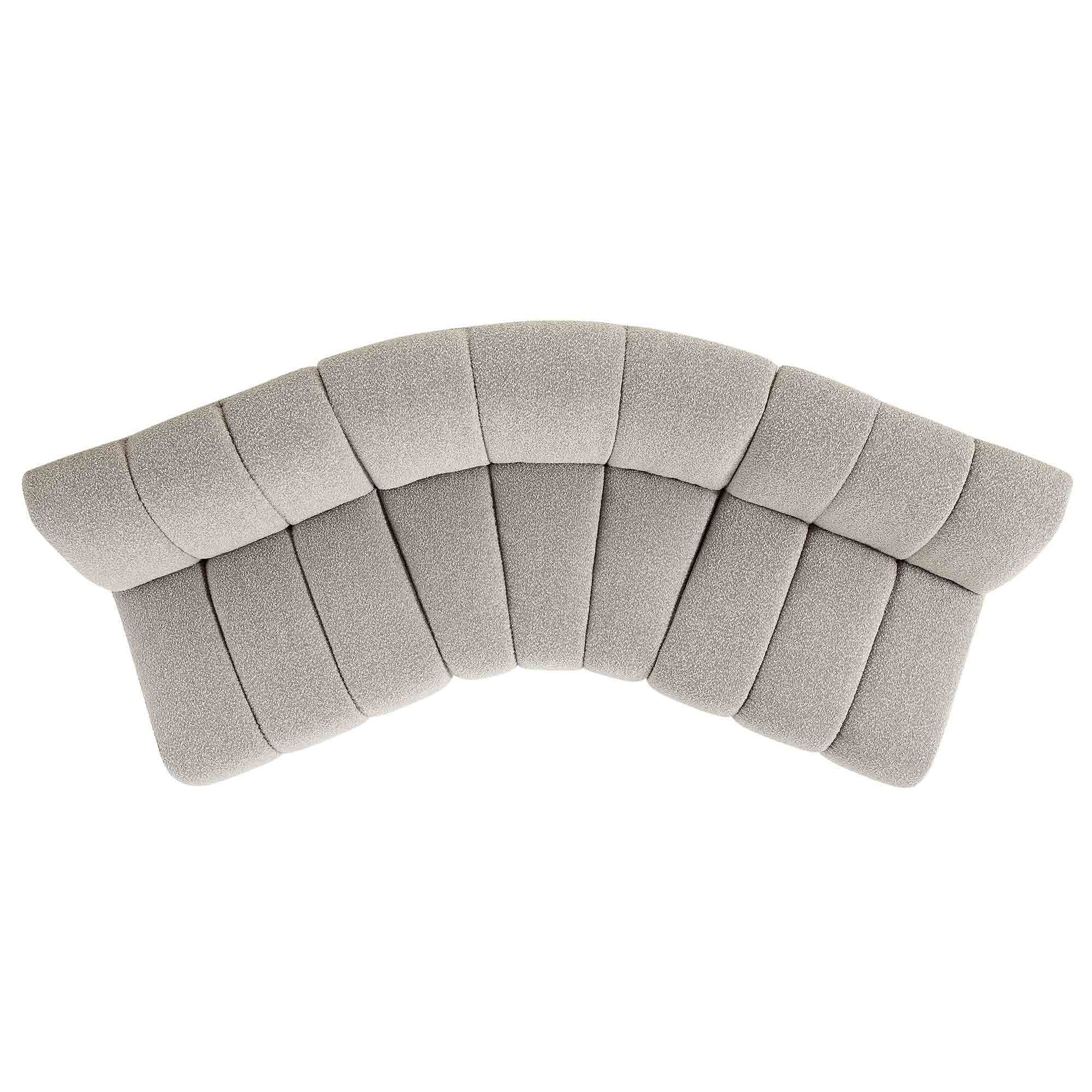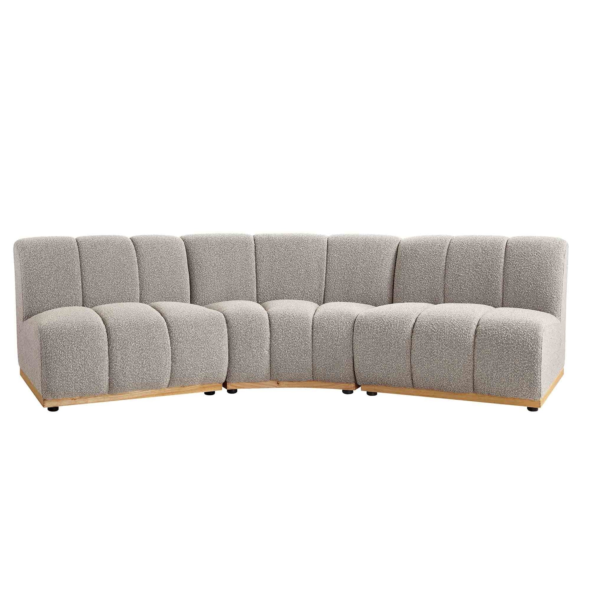 - Upholstered with beautiful taupe boucle fabric, the sofa modules are mounted on natural solid wood bases.