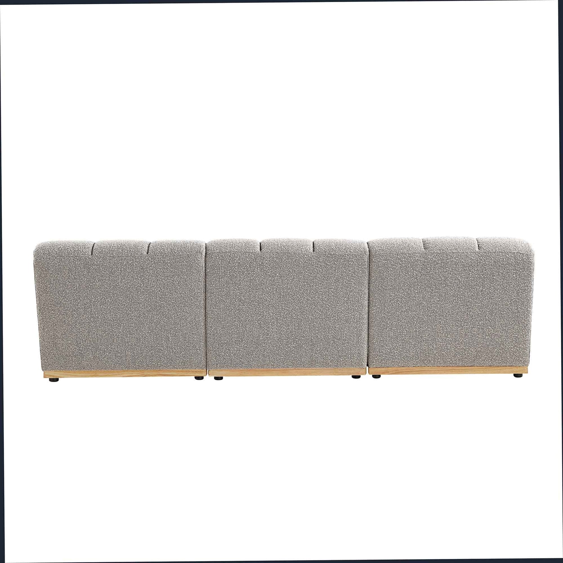 - Upholstered with beautiful taupe boucle fabric, the sofa modules are mounted on natural solid wood bases.